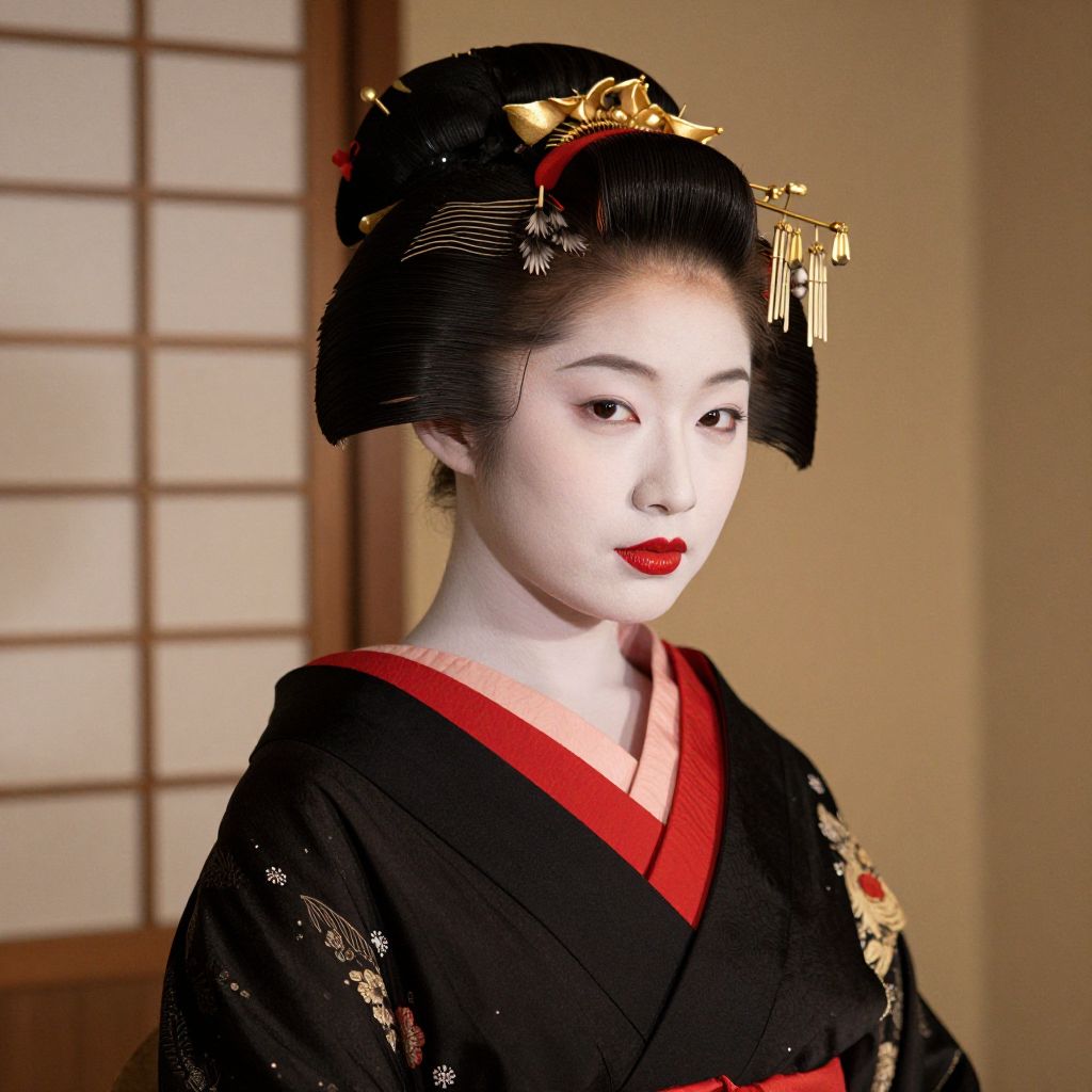 Photograph of a young Asian woman with fair skin, wearing a traditional Japanese kimono. She has black hair styled in an elaborate updo adorned with gold and red hair accessories and black hairpins. Her kimono is black with red accents and intricate gold embroidery on the left side. She has bright red lipstick and a serene expression. The background features a shoji screen with a wooden frame, adding to the traditional Japanese setting. The lighting is soft, highlighting her face and the details of her kimono.