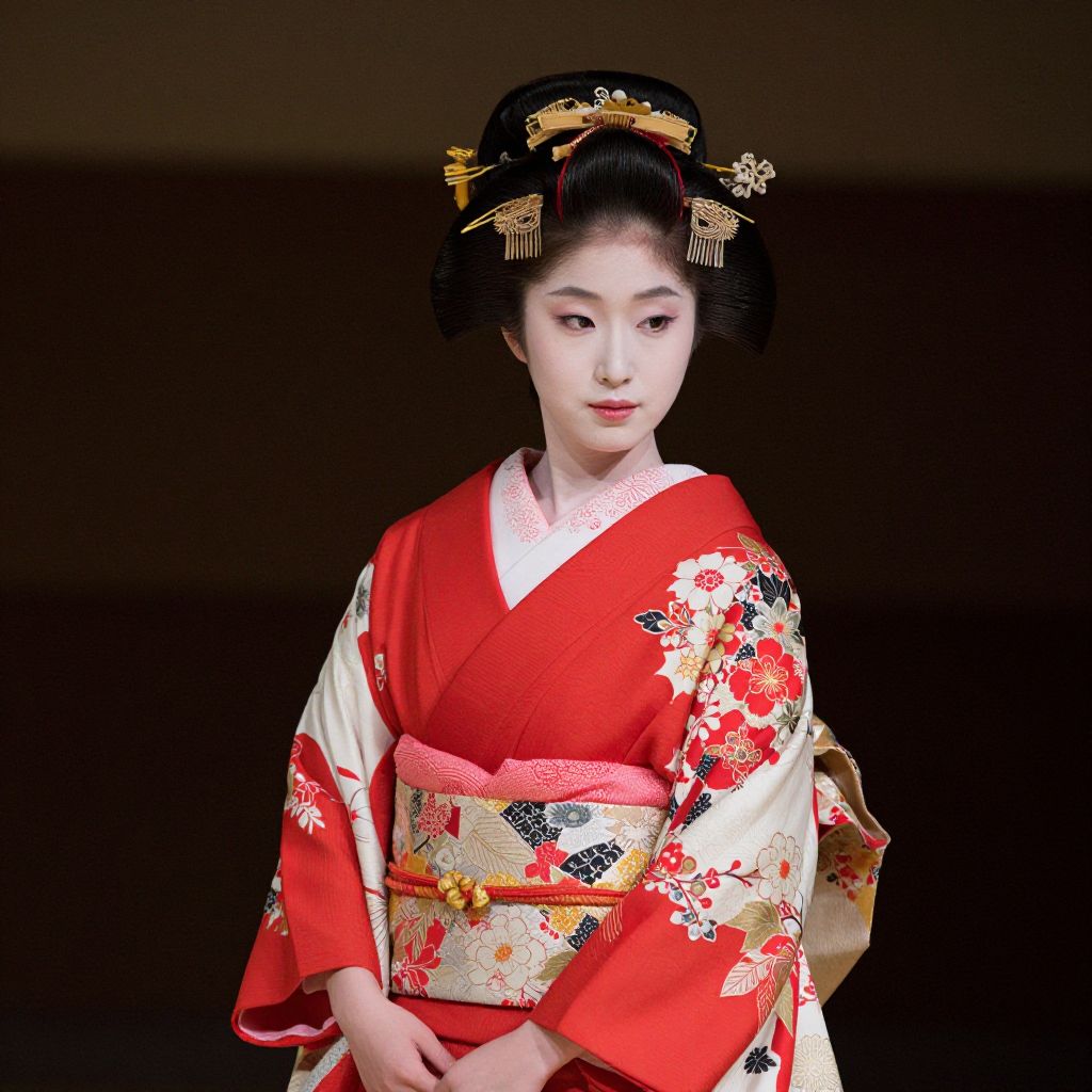 Photograph of a Japanese geisha with pale skin, red lipstick, black kimono with red trim, and ornate black hair accessories, standing in