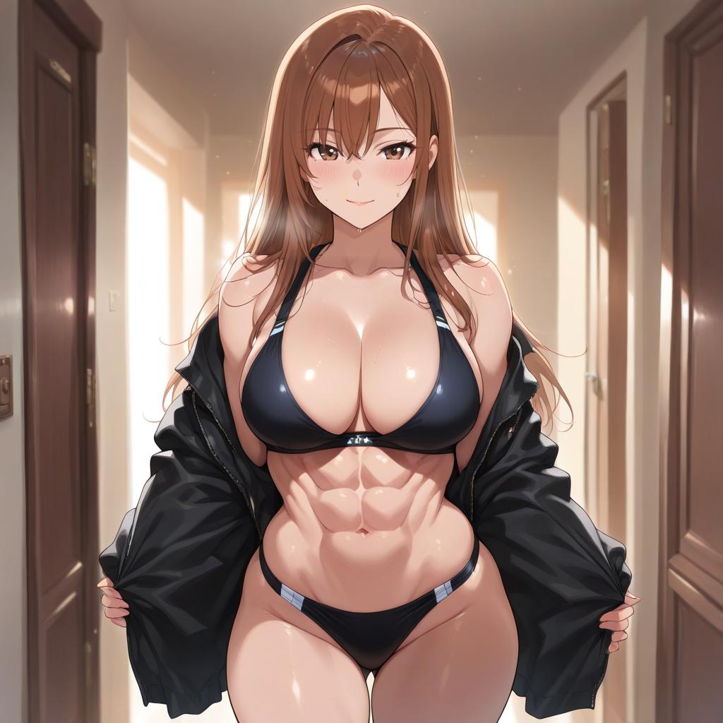 1girl, ripped, abs, smile, standing, perfect face, perfect lighting, looking at viewer (masterpiece, best quality, high quality, highres:1.2), detailed, extremely detailed