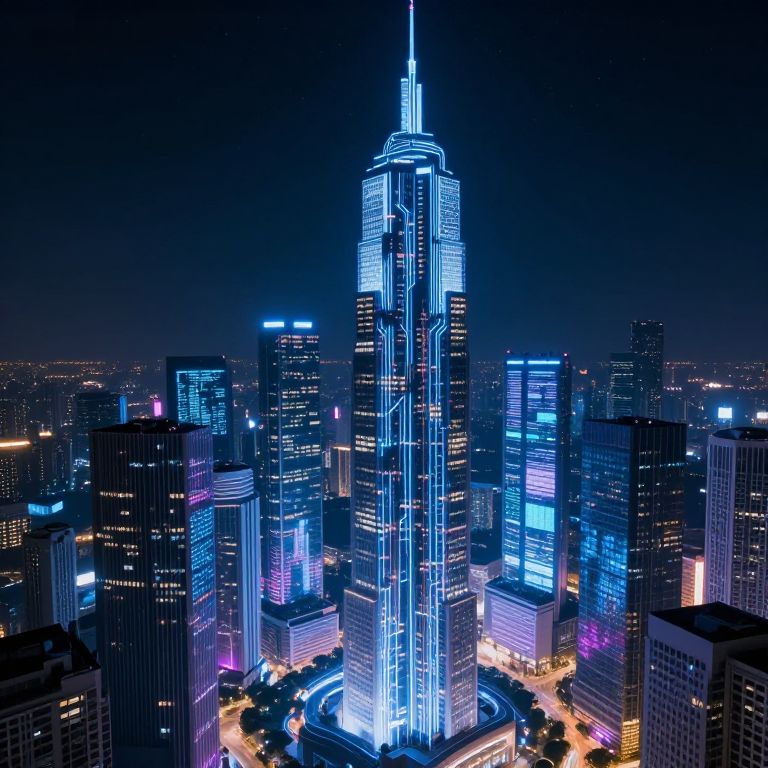 Photograph of a futuristic cityscape at night, featuring a brightly illuminated skyscraper with neon blue lights, surrounded by glowing buildings and streets.