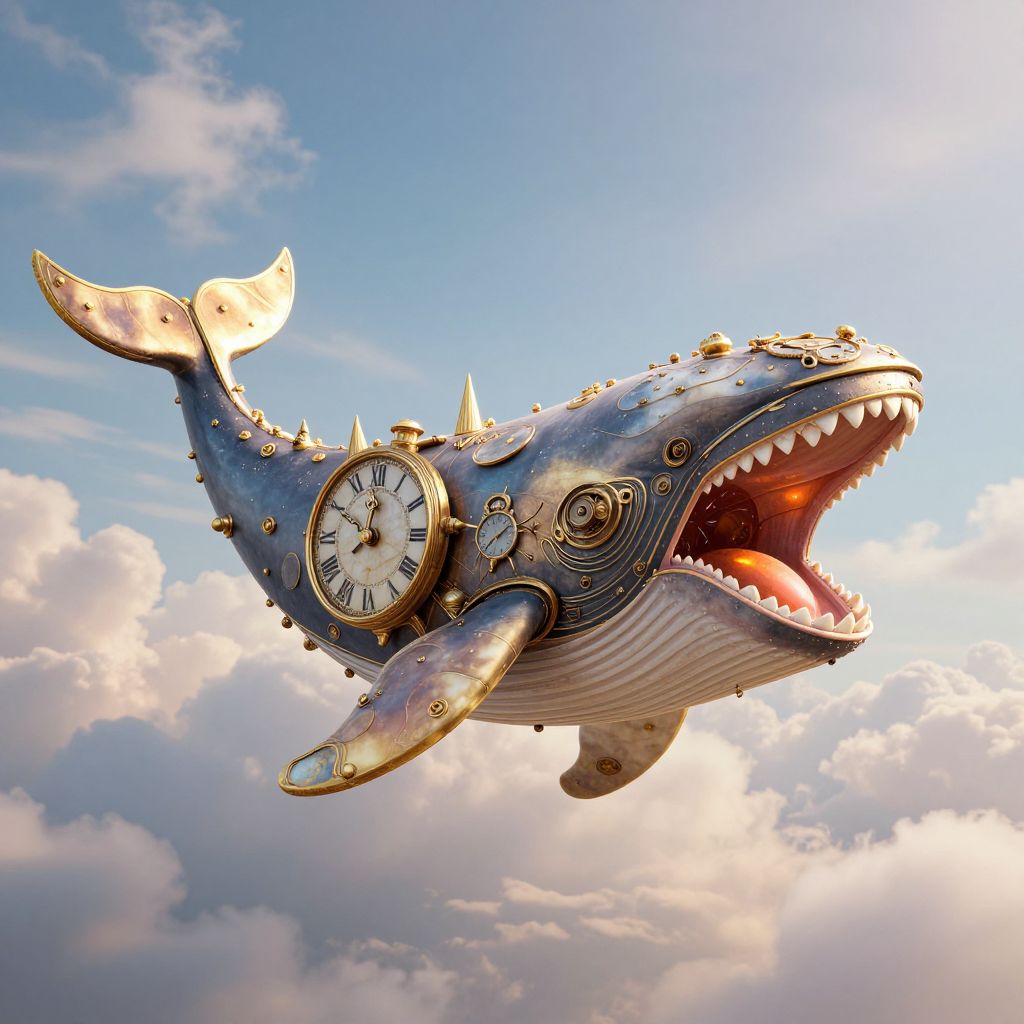 A fantastical 3D-rendered clockwork whale, adorned with golden spires and a large Roman numeral clock on its side, soars majestically through a dreamy sky filled with fluffy clouds, its open mouth revealing sharp teeth and a glowing orange interior, symbolizing the whimsical digestion of time and the warmth of cherished memories.
