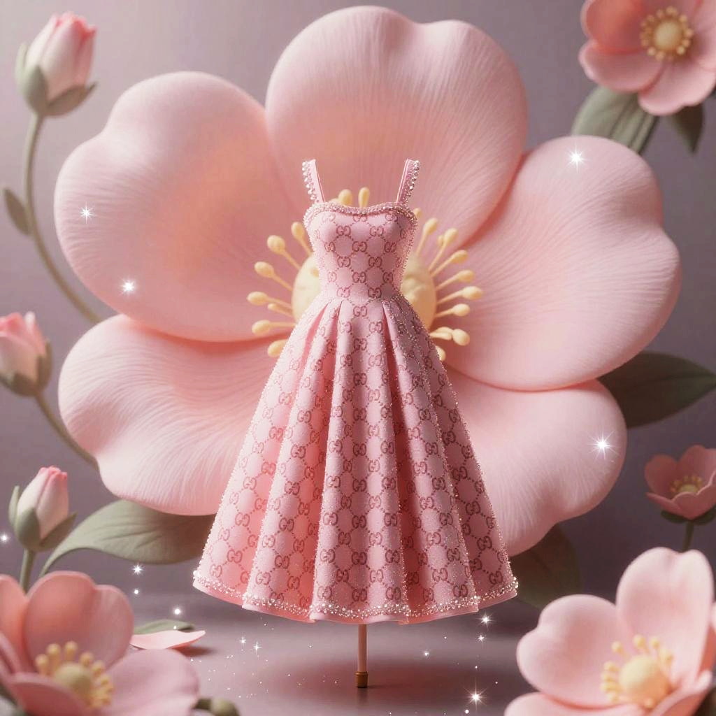 Pink gucci dress, surreal fantasy environment, oversized blossoms, sparkling details, whimsical atmosphere, ethereal glow, dreamlike art style
