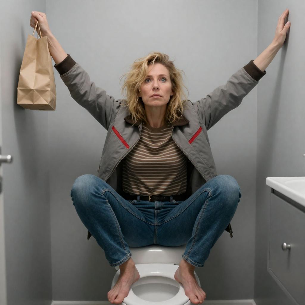 Photograph of a middle-aged woman with messy blonde hair, wearing a gray jacket with red stripes, brown striped shirt, and blue jeans, squatting on a toilet. She holds a brown paper bag in her right hand, arms raised against the gray bathroom walls. The toilet is white, and a small gray cabinet is to her right.