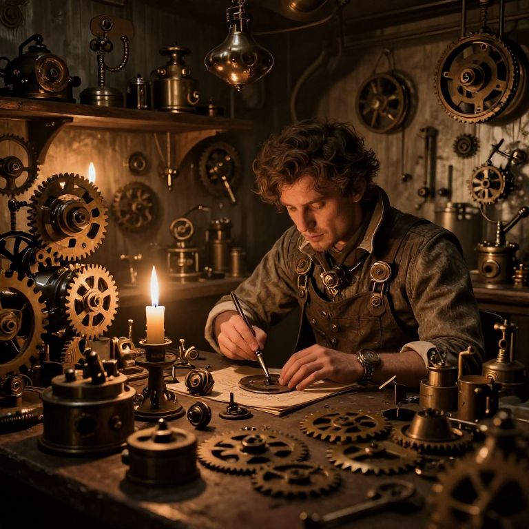 Prtes shown as a steampunk inventor’s workshop, cluttered with gears and gadgets, warm sepia tones with flickering candlelight, an atmosphere of creativity and old-world charm, detailed mechanical contraptions in the background