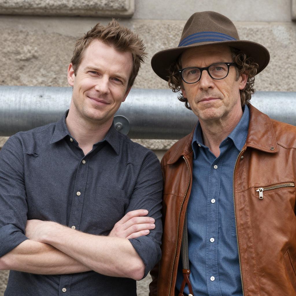 Photograph of a man with short brown hair, brown leather jacket, beige shirt, brown pants, leaning against a pink wall with one arm extended. He stands on a wooden sidewalk, leaning on a white tree trunk. Background includes a small black table and wire fencing. Intense, focused facial expression.