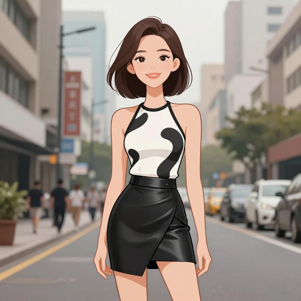Woman with pretty face and pretty hair. smiling Woman, modern urban, cropped white blazer with black trim, structured shoulders, open front, paired with a black cropped top, high-waist black skinny trousers, minimalist design. --sref 1467