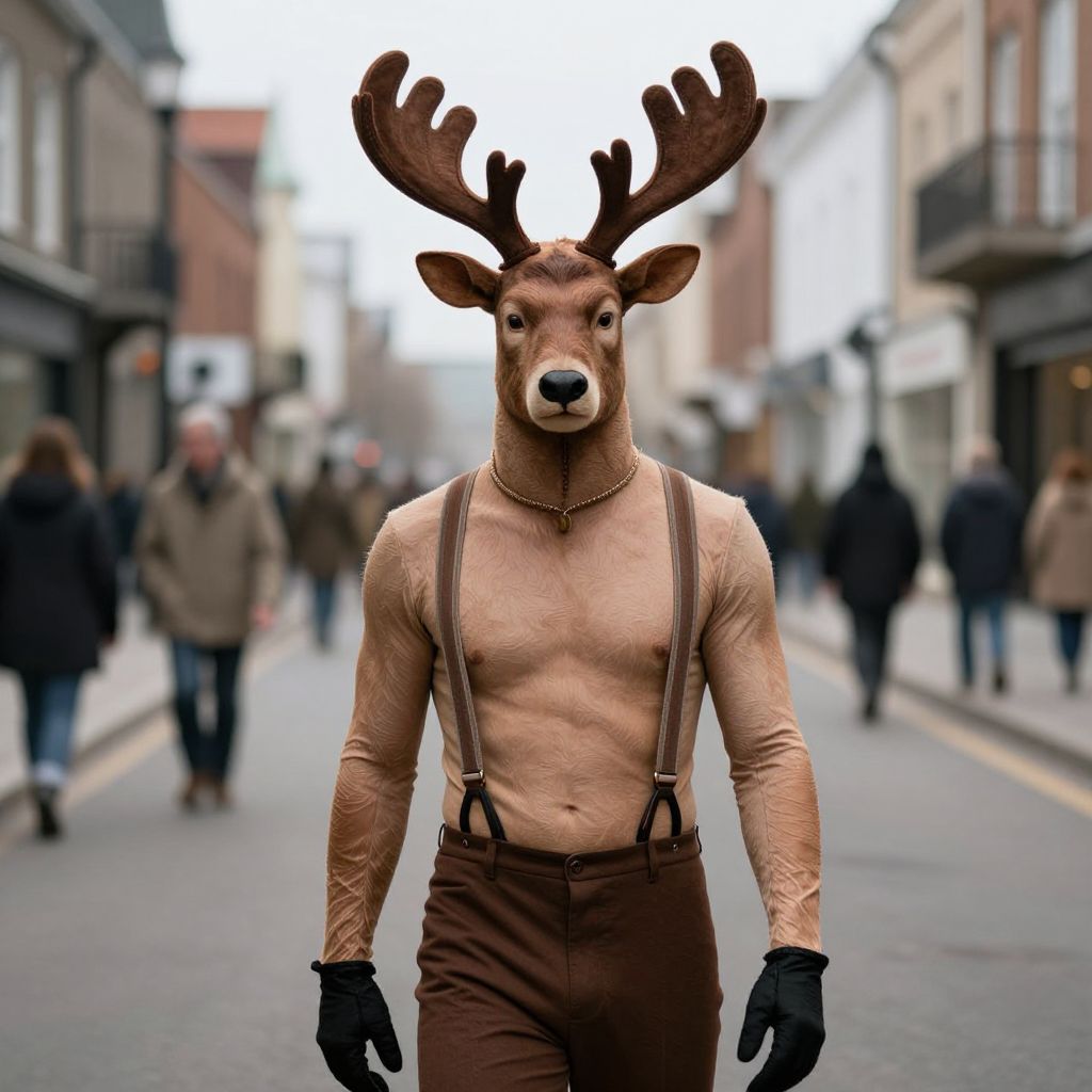 Photograph of a shirtless, muscular anthropomorphic deer with brown antlers, wearing brown pants, suspenders, and black gloves, walking down a