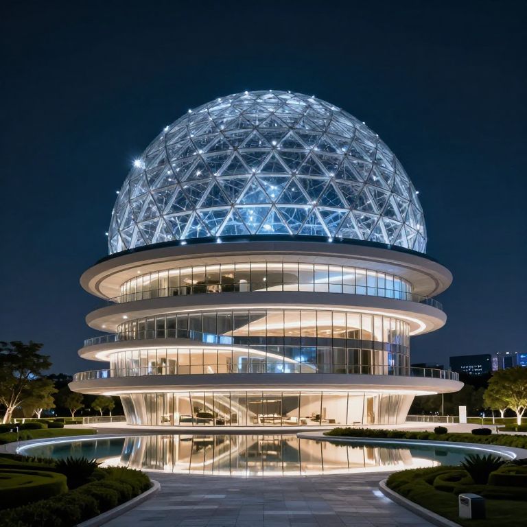 A futuristic, digitally-rendered image of a sleek, modern building at night. The structure features a large, glowing, geodesic dome on top with star-patterned lights, and multiple circular glass floors illuminated from within. The building is surrounded by a reflective pool and landscaped greenery. The sky in the background is dark blue with a gradient to black, and the overall scene has a sci-fi vibe.