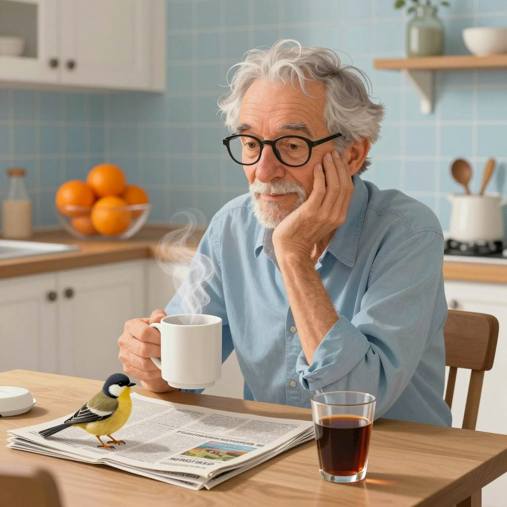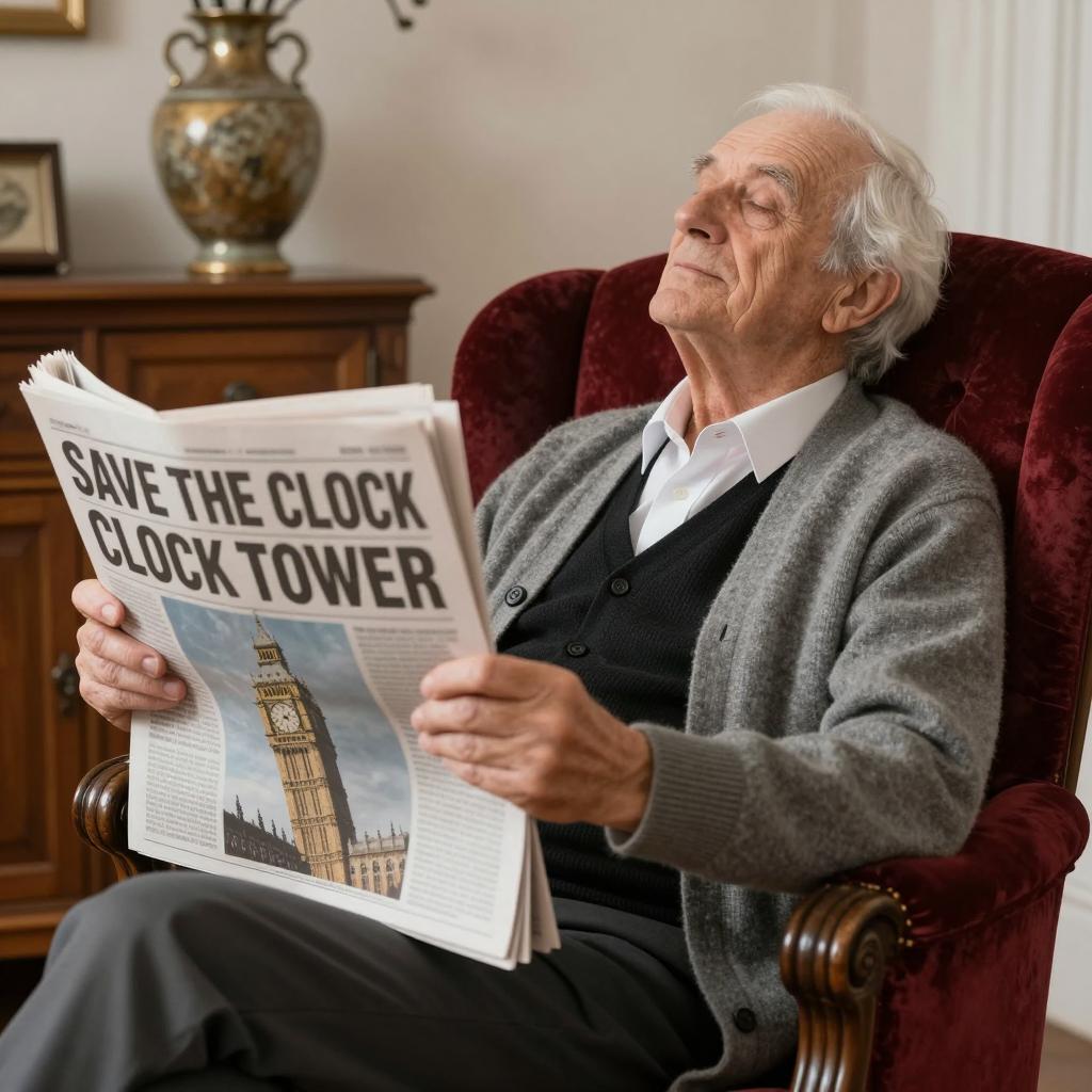 Old man with white hair, sitting on red velvet chair, head tilted back, eyes closed. Wearing gray cardigan, black vest, white shirt. Hand holding newspaper with "SAVE THE CLOCK TOWER" headline, photo of clock tower. Wooden cabinet and vase in background.