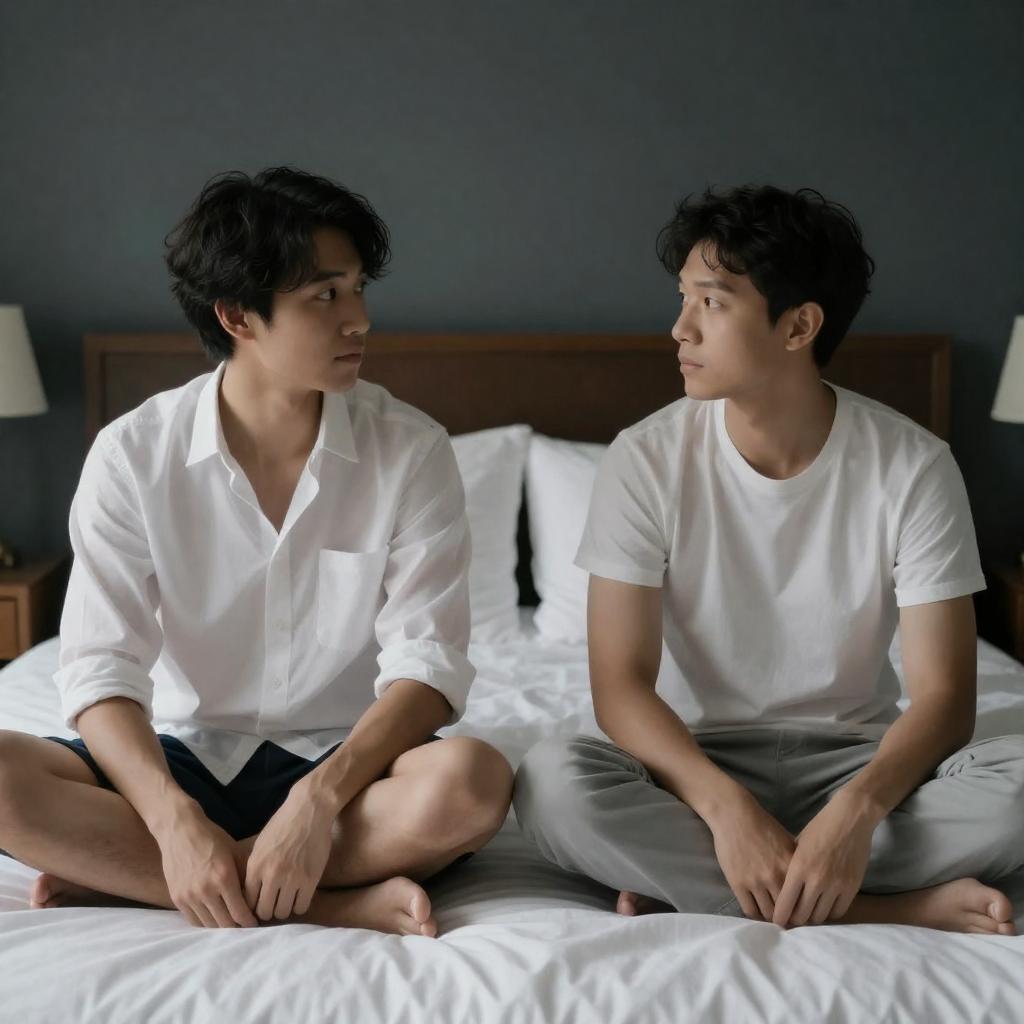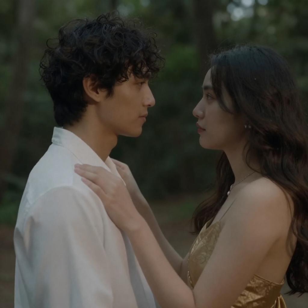 Photograph of two people in a park. Woman with dark hair in ponytail, wearing black top and gray pants, sits on rock, looking downward. Man with brown hair, wearing black hoodie, sits beside her, looking up at her. Trees and blurred background. Woman's expression is serious.