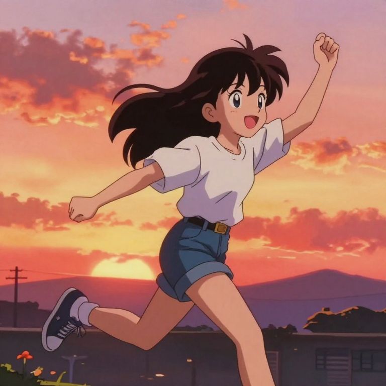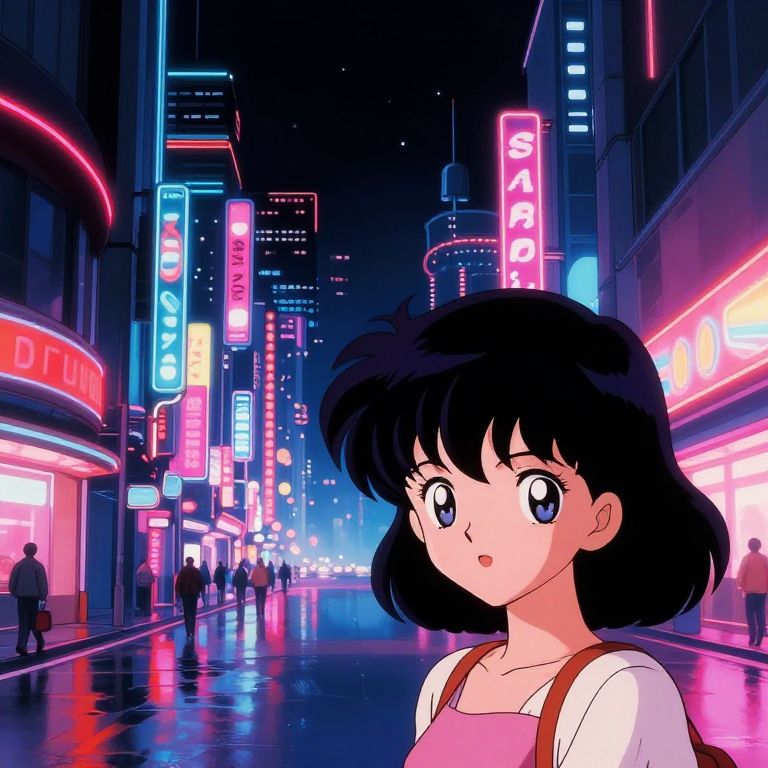 1980 anime style vibrant cityscape at night, neon lights reflecting on wet streets, characters with large expressive eyes and detailed hair, retro futuristic vibe, cinematic lighting