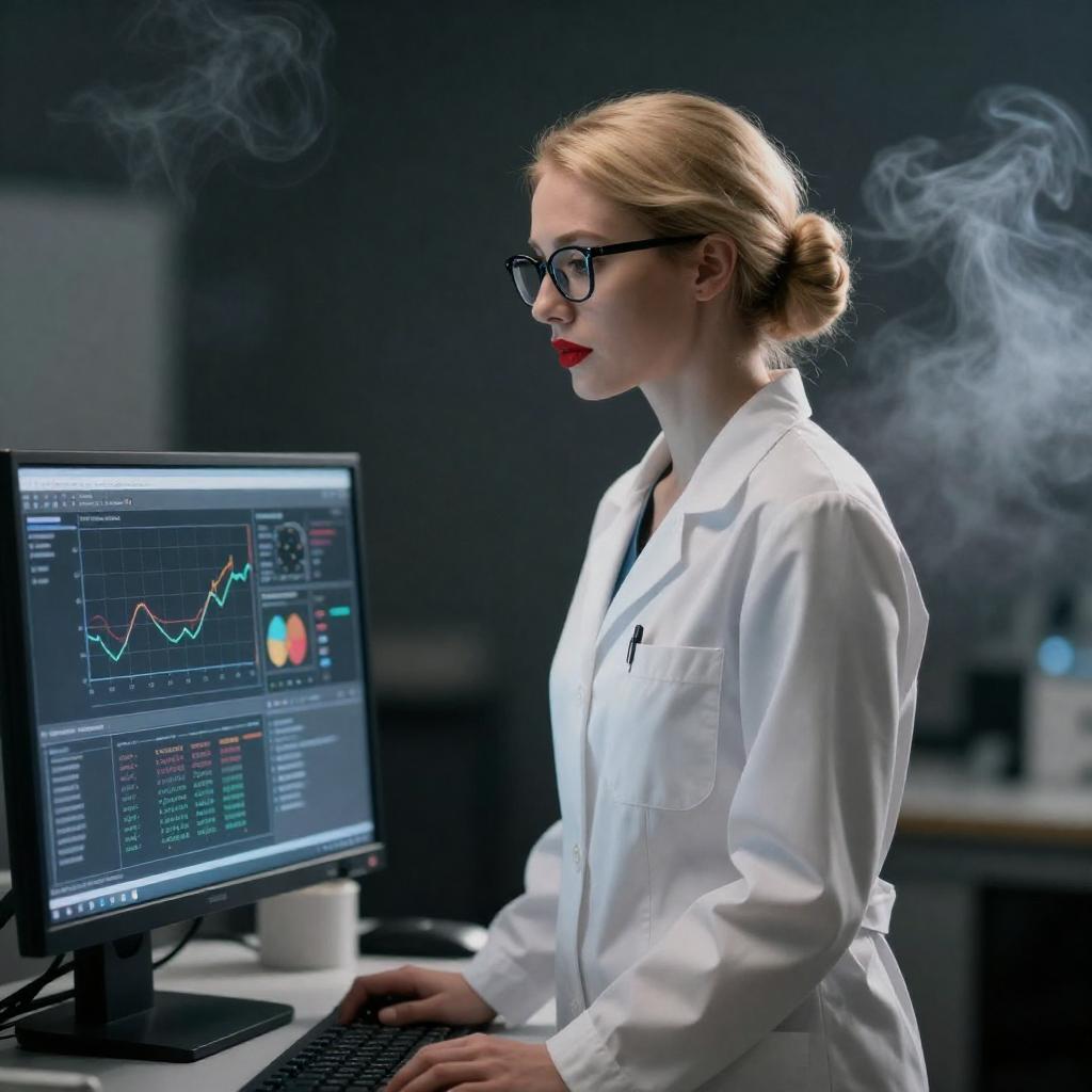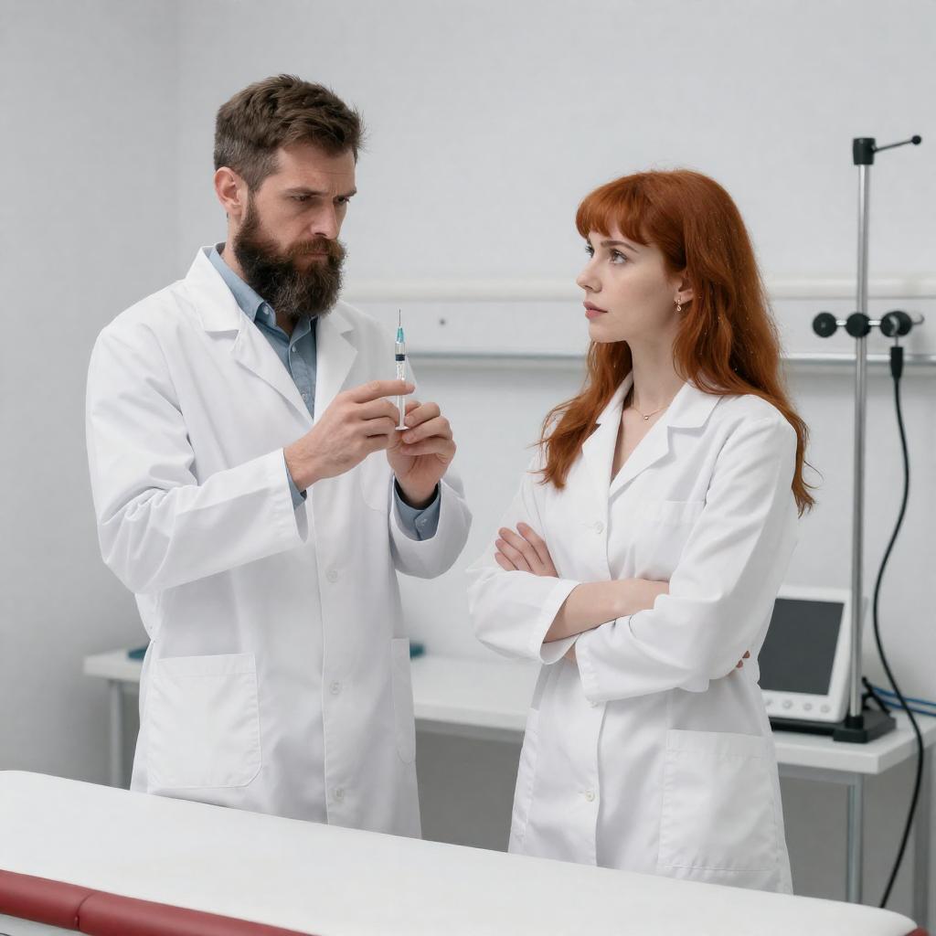 Photograph of a medical examination room. A bearded man with a dark beard and brown hair in a white lab coat holds a syringe, looking serious. A red-haired woman with bangs, also in a white lab coat, stands with arms crossed, looking at him. A medical equipment stand with cords is on the right. A white table with red and white cloth is in the foreground.