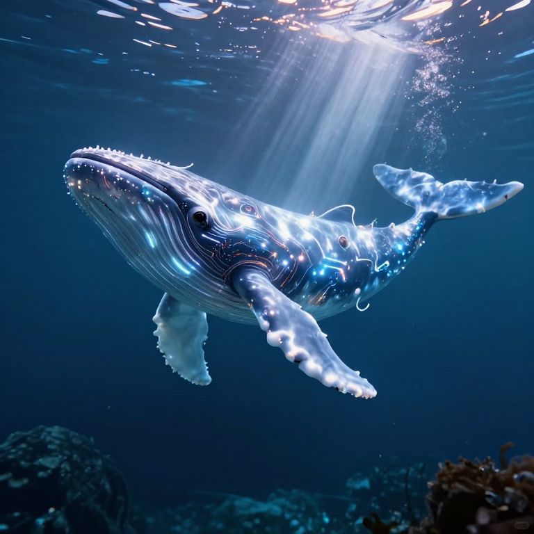 A luminous, mechanical whale adorned with glowing circuits and ethereal tendrils gracefully swims through an otherworldly underwater cavern, its translucent body refracting beams of sunlight into a mesmerizing dance of light and shadow.