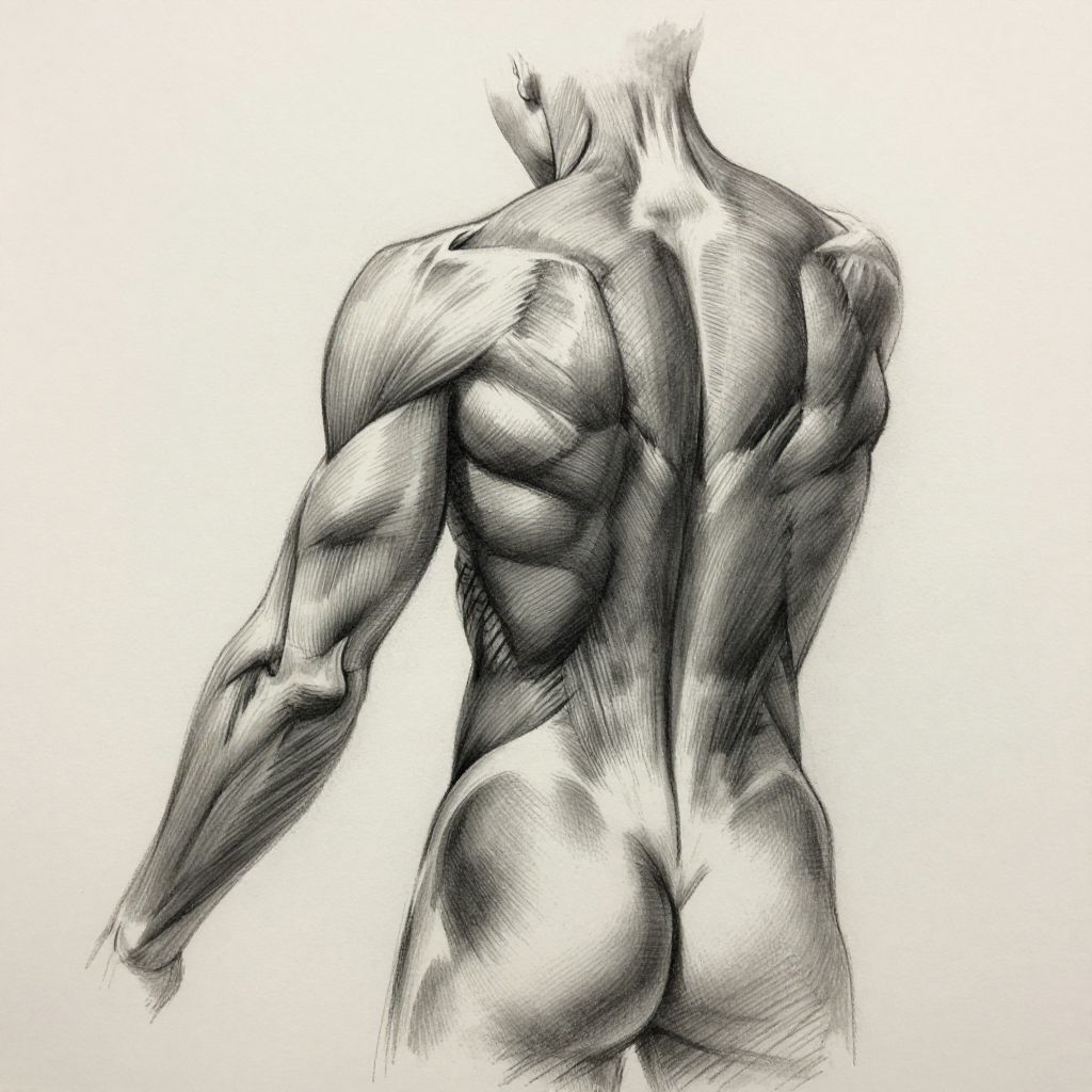 Trapezius muscle artist's sketch, dynamic pose showing muscle contraction, realistic shading and highlights, monochromatic charcoal style, human back view, anatomical study with artistic expression, subtle background, fine detailed muscle striations