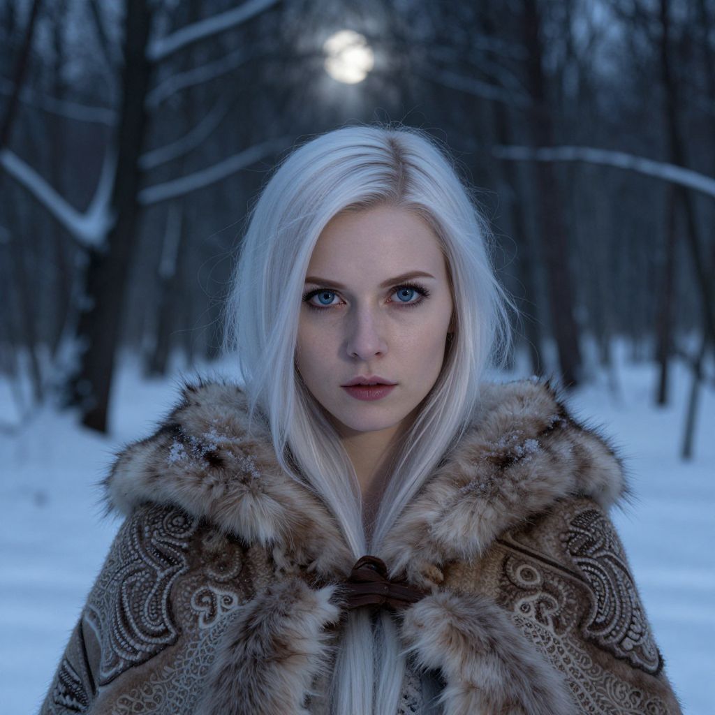 Envision a captivating portrait photograph of a Slavic woman with piercing ice-blue eyes and sleek platinum hair, her enigmatic gaze fixed upon an unseen observer. Captured from a unique worm's-eye perspective, this shot emphasizes the elegance of her features and the intensity of her stare. She stands in a snow-covered forest clearing, bathed in ethereal moonlight that filters through bare tree branches, creating an atmosphere of solitude and enchantment. The soft glow illuminates intricate patterns on her handcrafted fur cloak, drawing viewers into her world. This ultrarealistic portrait invites exploration of the subtle emotions reflected in her porcelain skin, evoking a sense of wonder and introspection.