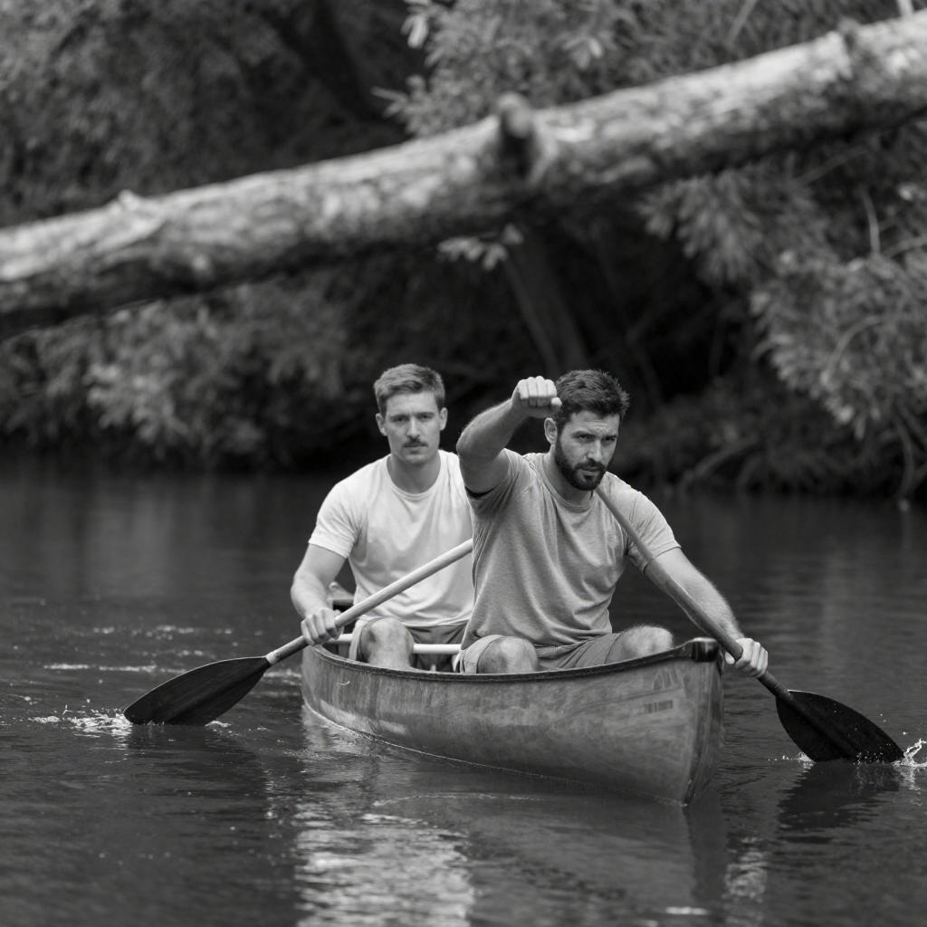 Black-and-white photograph of two men in a wooden canoe on a reflective river. The man in the foreground, with short dark hair and a beard, rows vigorously while the man behind him, with short hair and a mustache, looks ahead. A large, blurred tree branch extends across the top. Dense foliage surrounds the river.