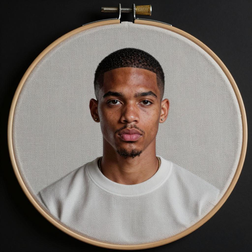 A dark-skinned man with short yellow-blonde hair, smiling with visible teeth, wearing small silver earrings. To his left, a red and brown eye with a screw stem stands upright. Dark background. Man's head slightly tilted, eye positioned near his left ear.