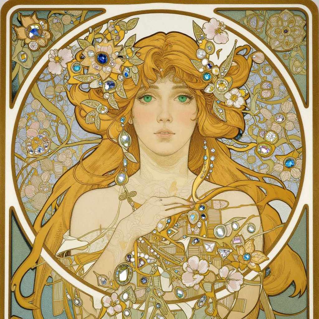 This digital artwork depicts a fair-skinned woman with red hair and a golden, ornate headpiece, standing in an elaborate, Art Nouveau-inspired setting. She wears a shimmering, gold dress adorned with large, colorful floral patterns and metallic, robotic arms. Her gaze is direct and confident. Behind her, a circular, intricate golden frame with floral motifs contrasts with a cityscape featuring classical architecture and a clear blue sky. The image combines elements of steampunk and Art Nouveau, blending human and mechanical features with elaborate, decorative designs. The overall style is highly detailed and vibrant.
