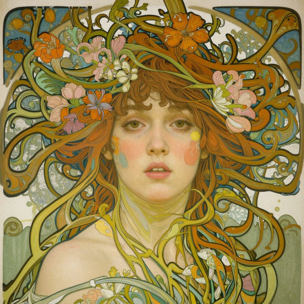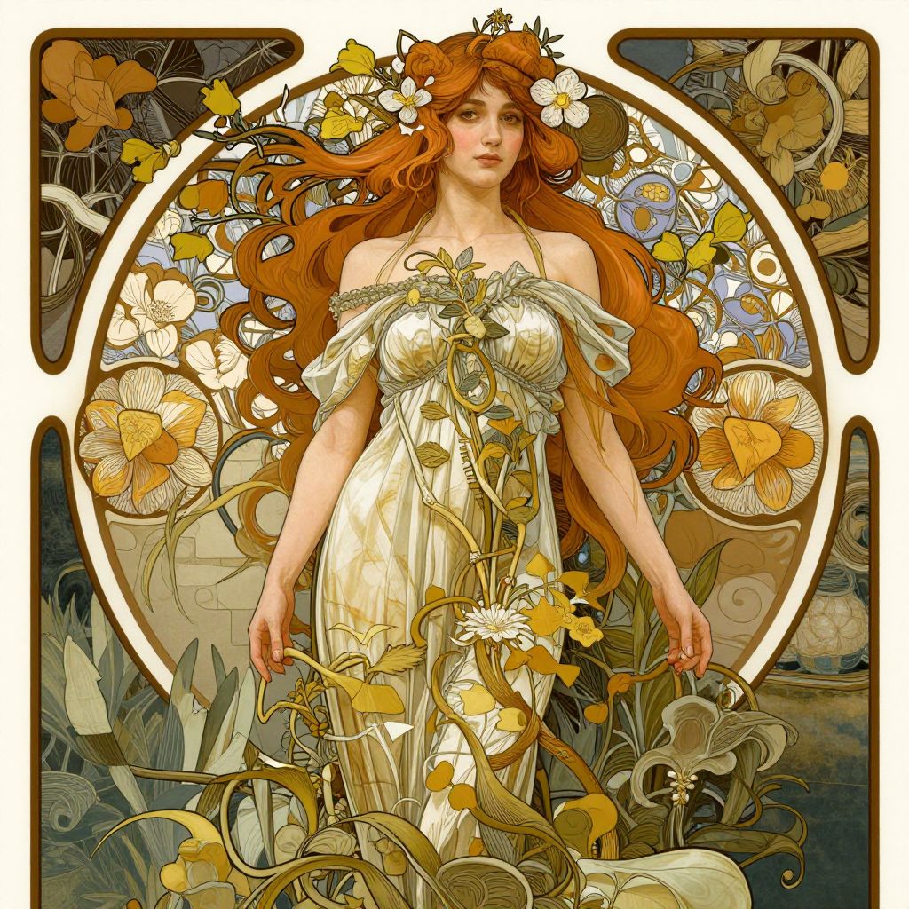 Digital art of a fair-skinned, red-haired woman with golden robotic arms and a flower-adorned gown, standing in front of an ornate