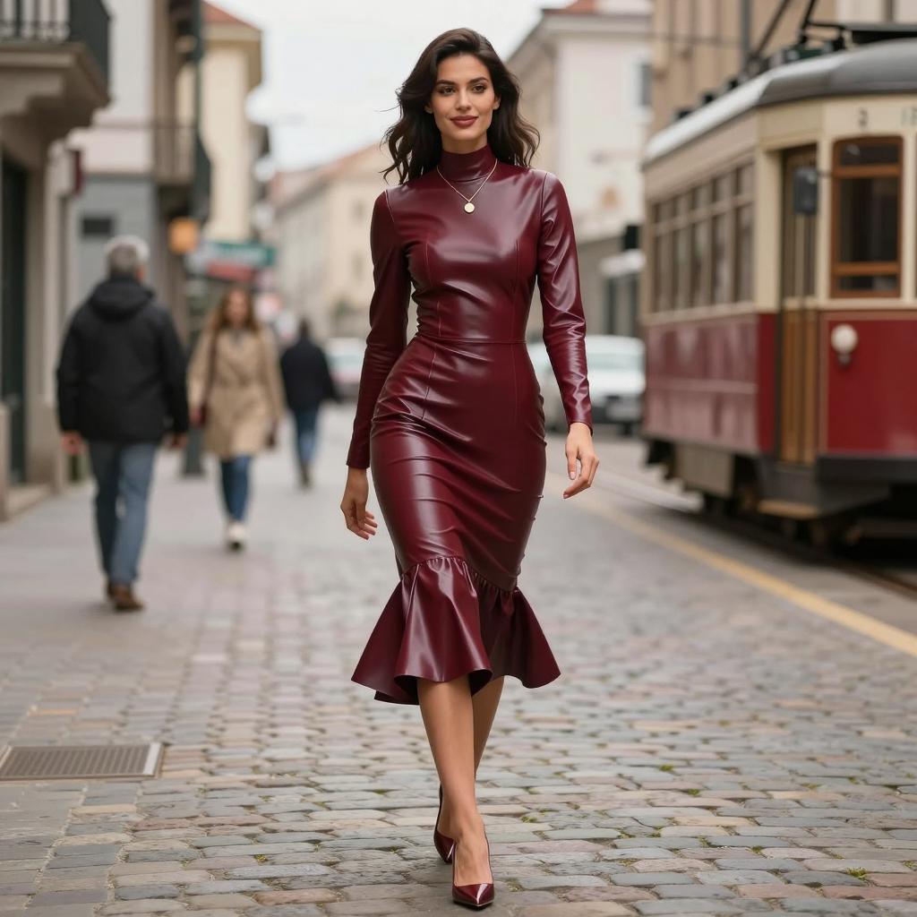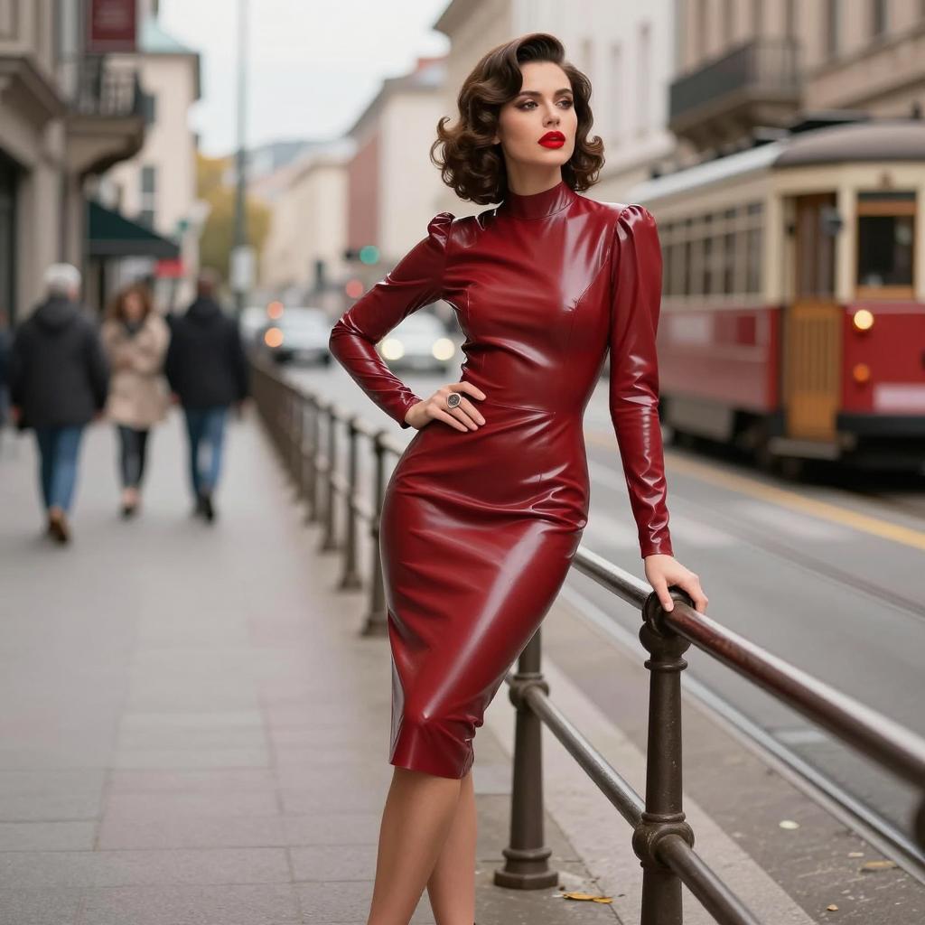 Fetish fashion woman in sleek latex midi dress, freckled woman with messy curls and subtle nude lipstick wearing deep burgundy latex sheath dress with high neckline and back slit with minimal jewelry and patent stiletto heels posed standing in the middle of the street with one hand brushing hair back, confident expression in historic district street with tram tracks and blurred pedestrians, editorial fashion illustration, soft natural light, ultra-detailed
