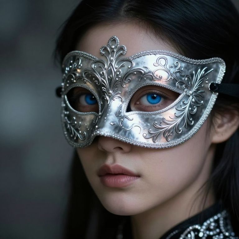 Craft a portrait photograph exuding an air of enigma, focusing on a mysterious figure with serene blue eyes against an ethereal backdrop. The subject, adorned in an intricate silver mask featuring delicate filigree patterns and subtle light reflections, directly engages the viewer's gaze, evoking curiosity and intrigue. This close-up three-quarter view framing showcases the interplay of light and shadow on the metalwork, revealing a subtle skin texture around the mask's edges, emphasizing the person's humanity beneath the disguise. Soft yet dramatic lighting emanates from an unseen source behind the subject, casting an ambient glow that highlights their captivating gaze while shrouding the background in a veil of mystery.