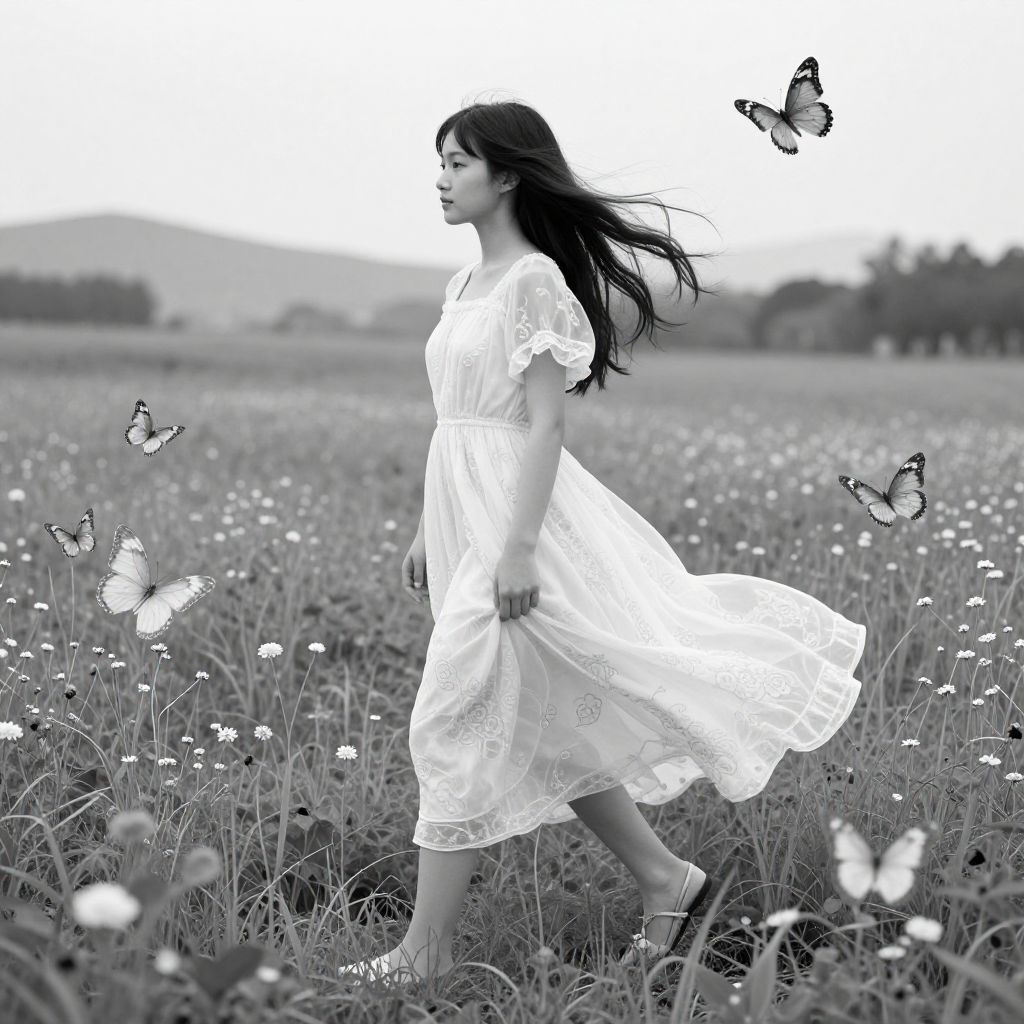 This enchanting black and white illustration features a young woman gracefully walking through a lush meadow, surrounded by delicate butterflies. The ethereal quality of her flowing dress, adorned with intricate patterns, contrasts beautifully with the understated landscape, creating a sense of whimsy and serenity.