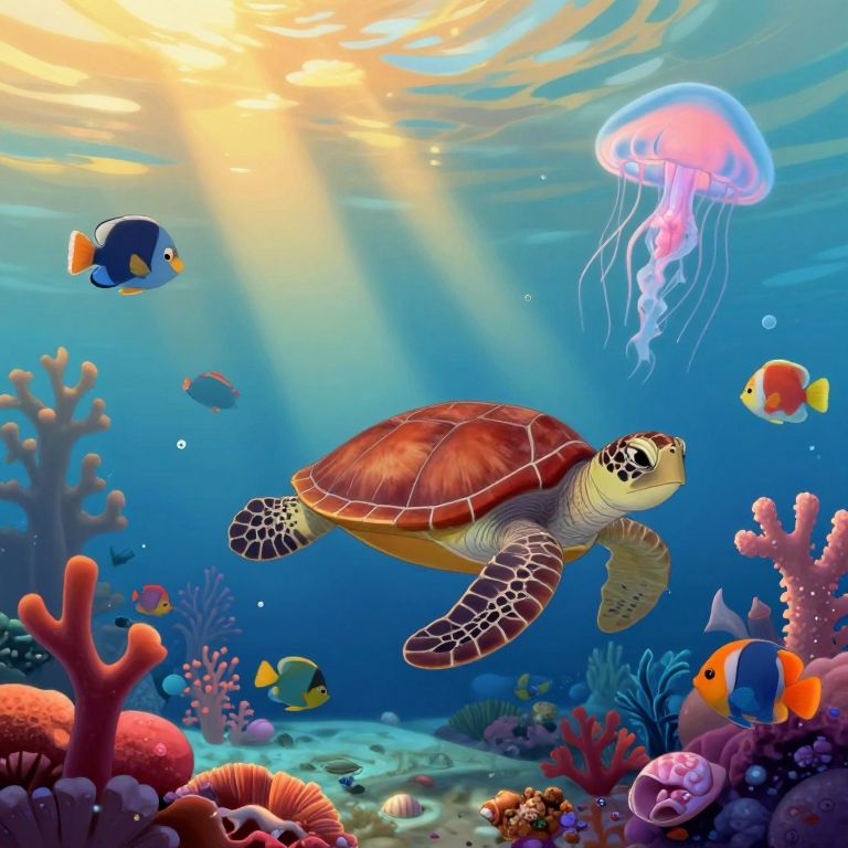 Colorful underwater scene: Sunlit turtle swims amidst vibrant coral, fish, and jellyfish, with beams of light filtering through the clear blue ocean.
