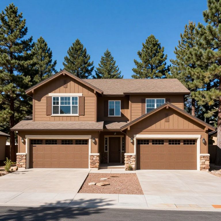 Sunny two-story home at 62 Lakeview Park Drive, Angel Fire, NM 87710, featuring a warm brown exterior, three garage doors, a central entrance with a covered porch, and surrounded by tall evergreen trees under a clear blue sky.