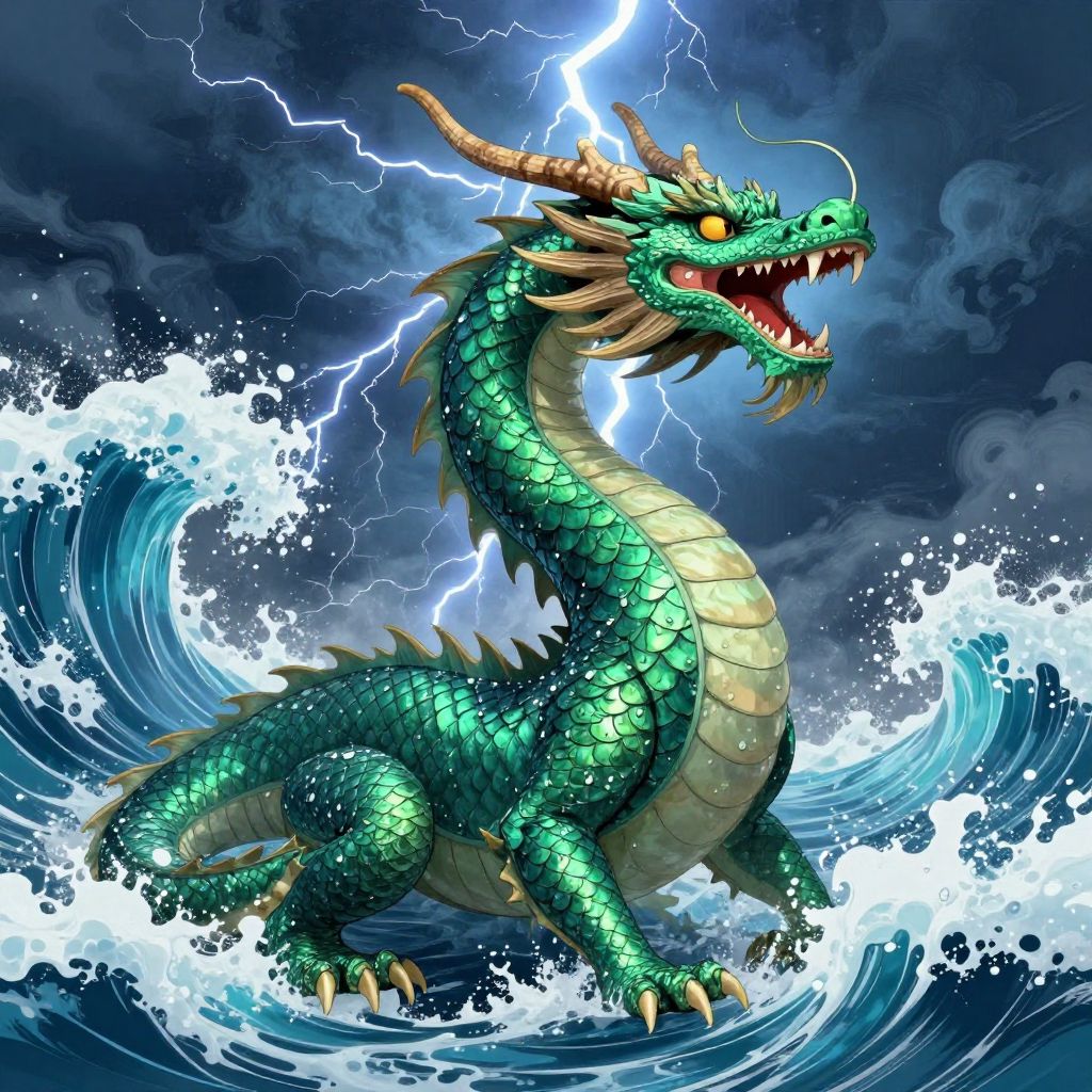Digital artwork of a vibrant green dragon with golden horns and scales, standing in the midst of a powerful ocean wave. The dragon's mouth is open, revealing sharp teeth, and its yellow eyes glow fiercely. Lightning bolts strike from a stormy, dark blue sky above, adding a dramatic effect. The dragon's textured scales glisten, contrasting with the frothy, white-capped waves surrounding it. The scene is dynamic, with the dragon's stance suggesting movement and power against the turbulent sea. The style is highly detailed and colorful, with a fantasy art aesthetic.
