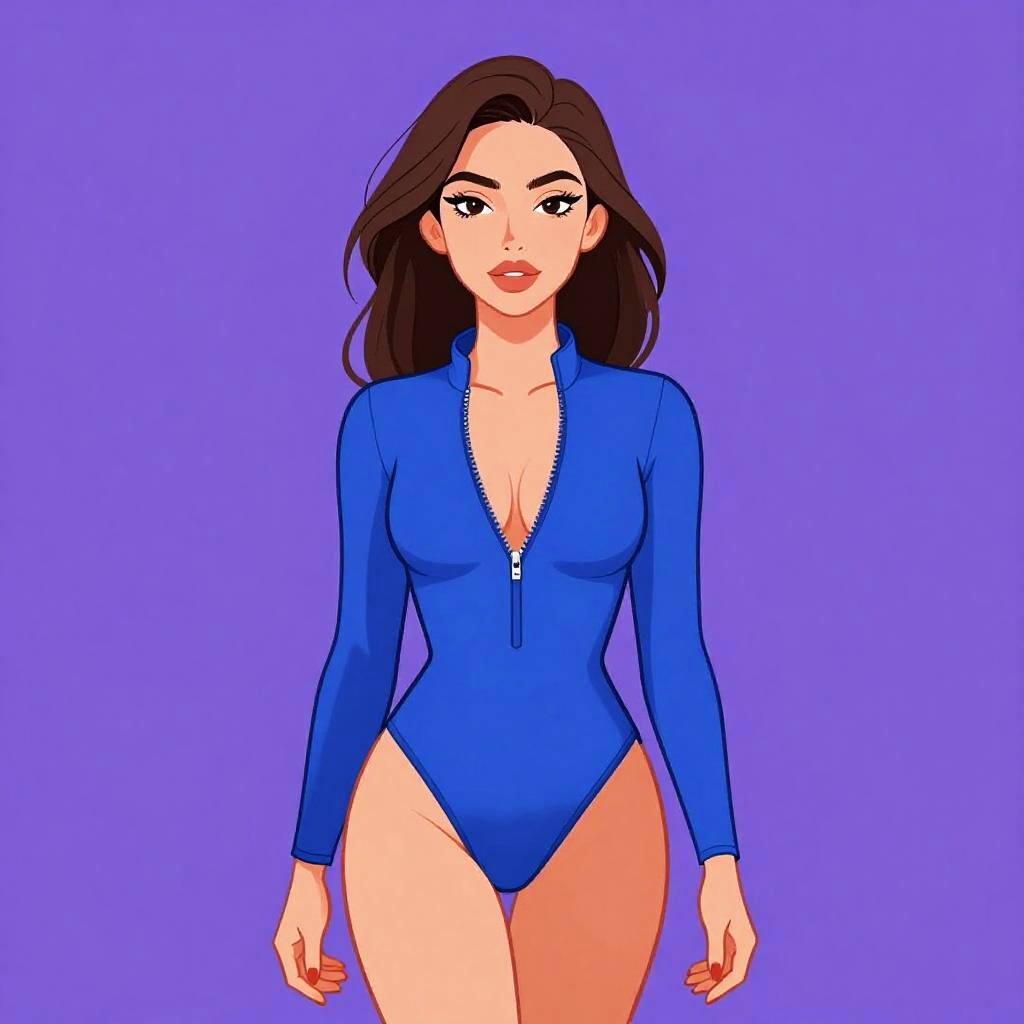 Woman with pretty face and pretty hair. Woman, sporty chic, royal blue bodysuit with a deep scoop neckline, long sleeves, and a front zipper detail, high-cut leg, plain background. --sref 1461