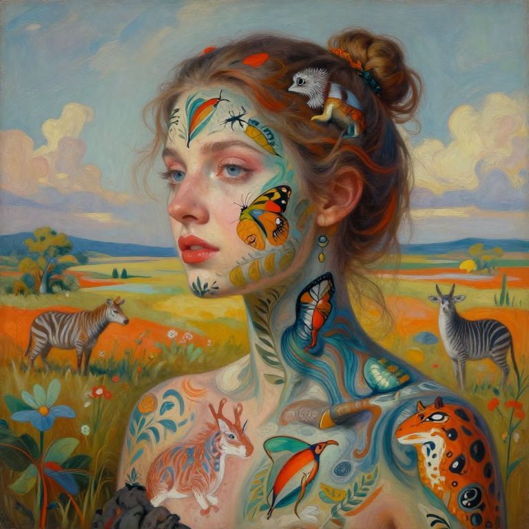 Digital painting of a woman with vibrant, nature-themed tattoos on her face and shoulders, set against a colorful savanna landscape with zebras and wildflowers