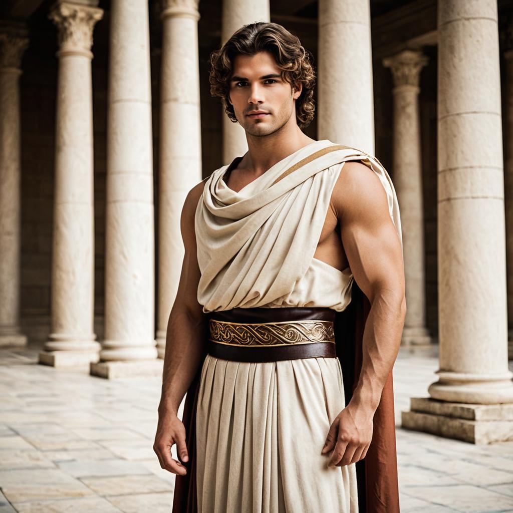 Man toga fancy dress, photorealistic portrait of a handsome young man with wavy brown hair, wearing ancient Roman-style outfit with beige and brown draped fabric, brown sash around waist, muscular build, standing in front of grand stone building with columns, natural light, daytime, slightly serious expression, casual pose, background slightly blurred, soft lighting, realistic ures, warm color palette, cinematic style