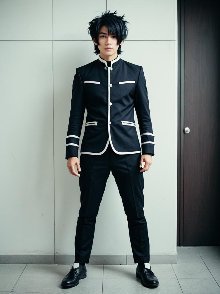 Man in Edgar Cut Hairstyle costume, full-body cosplay photo, photorealistic style