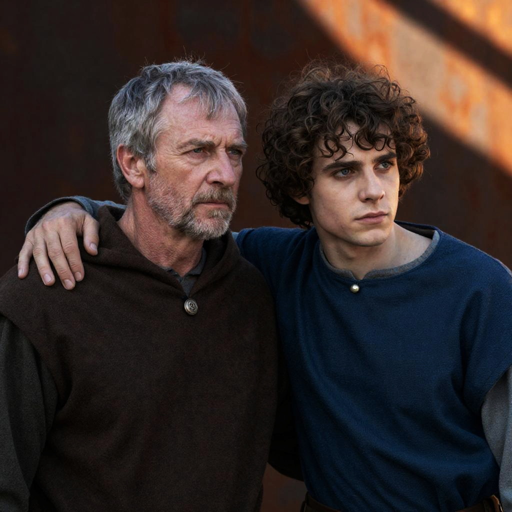 A young man with curly brown hair wearing a blue coat and brown scarf stands with hands clasped in a rustic outdoor setting covered with hay. In the background, four people dressed in vintage-style striped and patterned clothing interact near wooden structures with smoke rising, suggesting a rural or historical environment.
