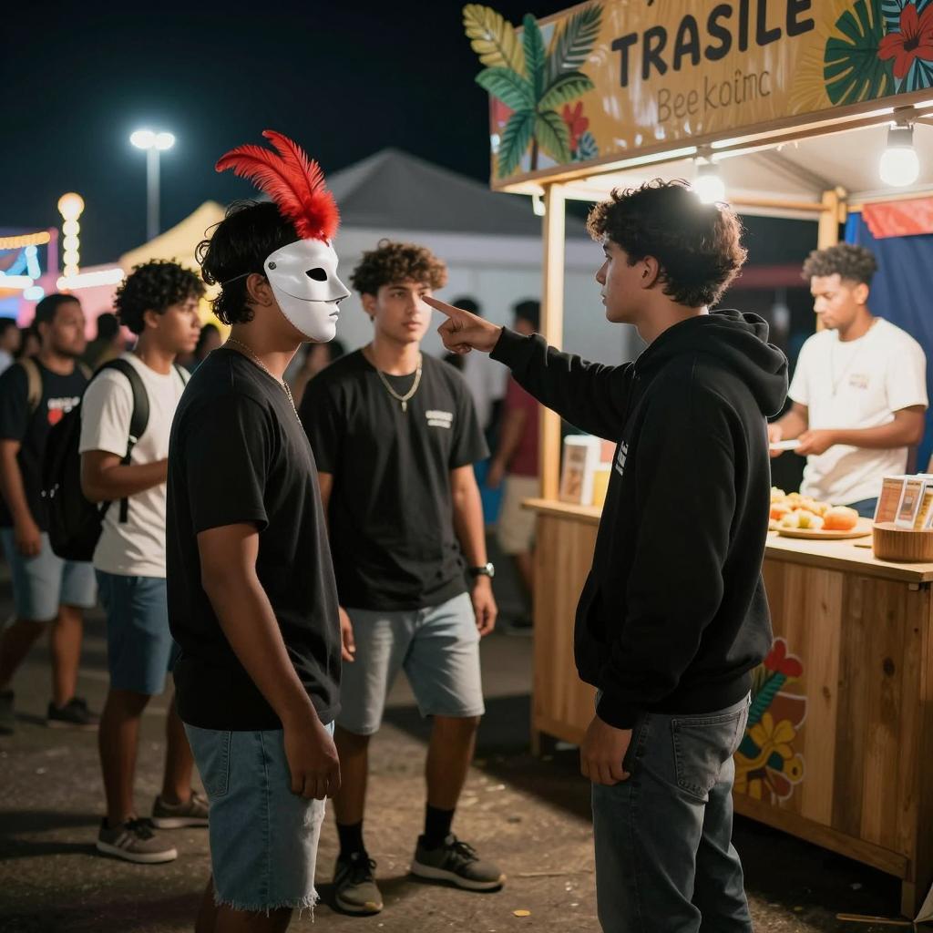 Nighttime carnival scene. Man in black hoodie points at person in white mask with red feathers, surrounded by others. Wooden booth on right, vendor in white shirt. Crowd, dim lighting, tropical decor.