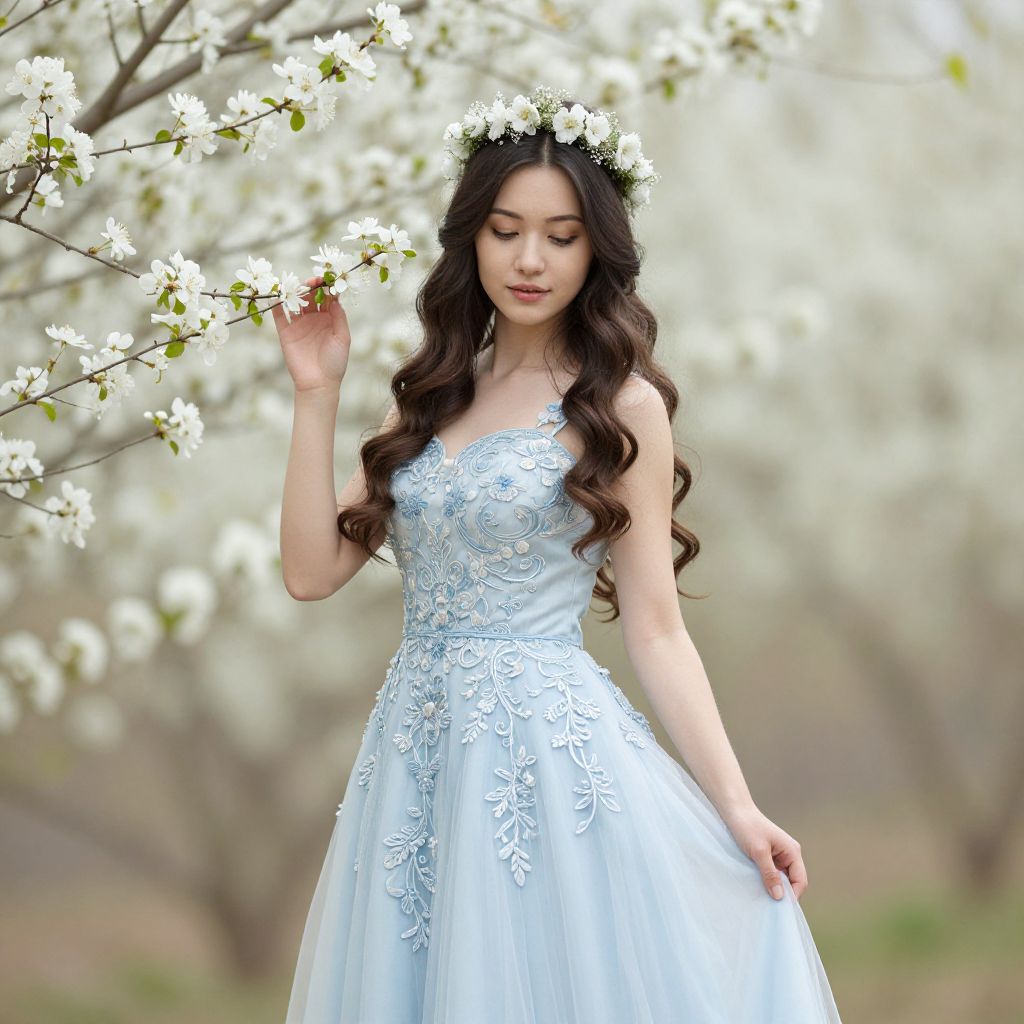 A young woman stands gracefully amidst blooming white flowers, wearing an elegant light blue gown adorned with intricate floral embroidery. Her long wavy hair is complemented by a delicate flower crown, creating a soft, ethereal atmosphere captured in a fine art portrait style.