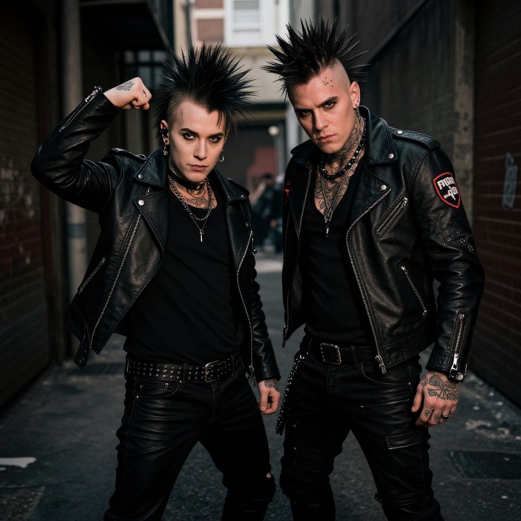 Fight Club couples costume, a creative take with punk aesthetics, spiked hair and tattoos, leather jackets with fight club logos, set in a grungy urban alley, dim ambient lighting, edgy and rebellious mood, highly detailed and dynamic poses.
