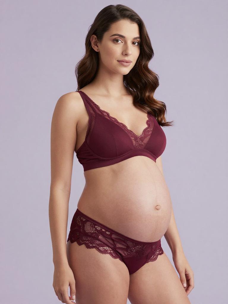 Portrait of a pregnant woman wearing a deep burgundy mesh balconette bra and mid-rise lace-trim panties. She has side-parted wavy brown hair, natural makeup, and a subtle baby bump. The photo is taken in a studio with a light lavender gradient background, featuring soft, flattering lighting and a serene expression.