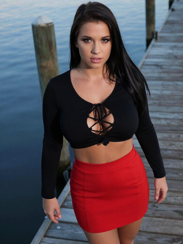 A Curvy woman, edgy in a black long-sleeve crop top with lace-up detail and a red A-line mini skirt, poses at a lakeside fishing dock, captured in an overhead shot. Sexy. Pretty face and beаutiful eyes. Big breasts