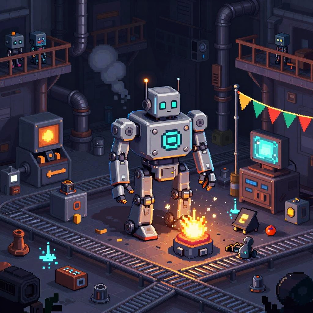Pixel art futuristic robot workshop filled with mechanical parts and sparking gadgets set in dimly lit industrial factory floor with pipes and conveyor belts, rendered in sleek 16-bit sci-fi pixel art with metallic tones, animated sparks, and detailed textures; saturated limited palette, tasteful dithering, soft bloom highlights, animated flags and water, tiny NPC sprites on balconies, atmospheric particles like smoke puffs or floating sparks, nostalgic cartridge mood, epic yet whimsical fantasy tone.