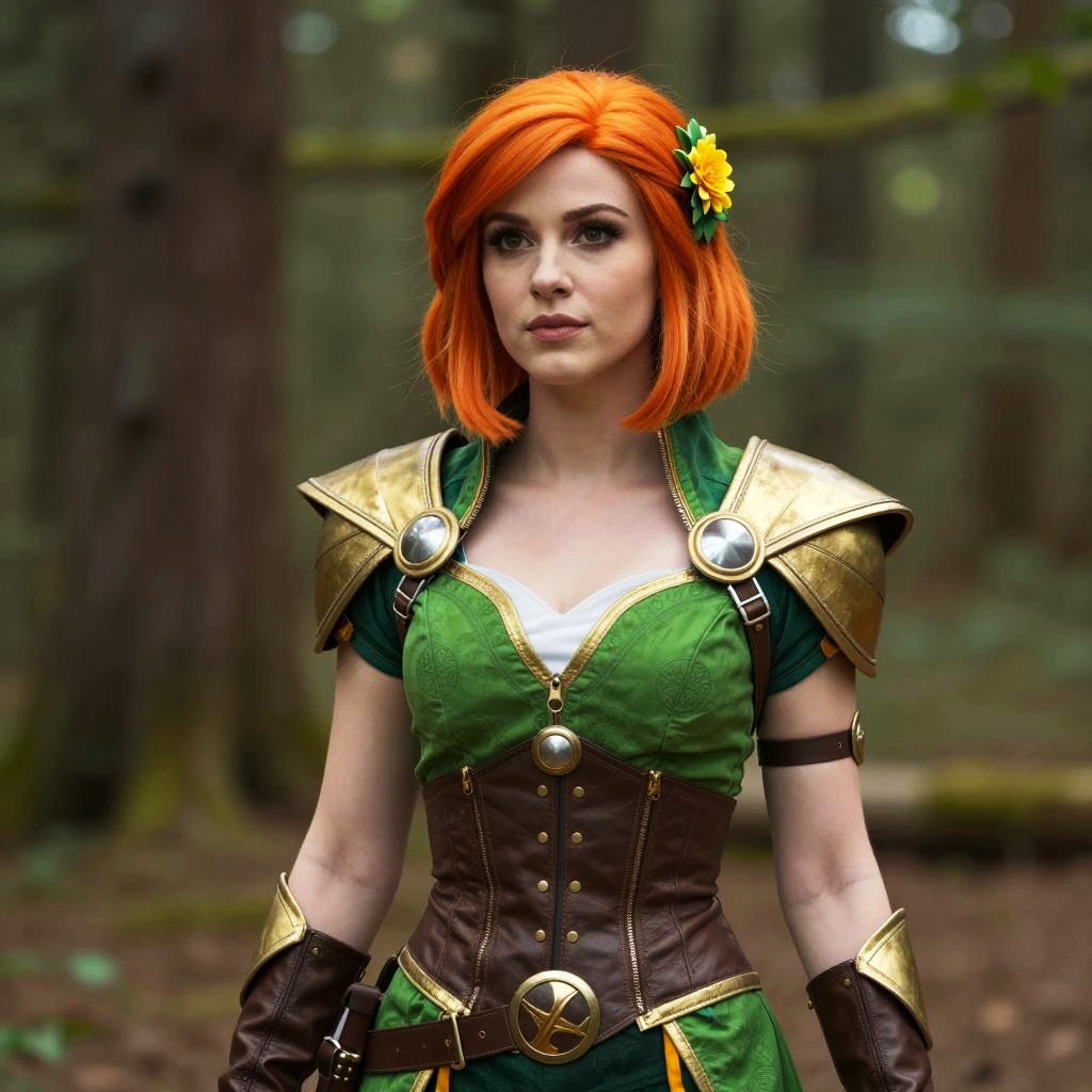 A woman with vibrant orange hair styled in a short bob stands in a forest setting wearing a detailed fantasy costume inspired by the character Gwen Tennyson. Her outfit features green and gold colors with armor-like shoulder pads, leather gloves, and a floral hair accessory, captured in a sharp, realistic photographic style.