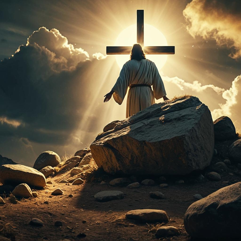 Photorealistic scene of angels at the empty tomb with a boulder rolled away, bathed in radiant light. Cross of Calvary visible amidst clouds, cinematic lighting, sharp focus, ultra HD, 8K resolution, intricate details and realistic textures