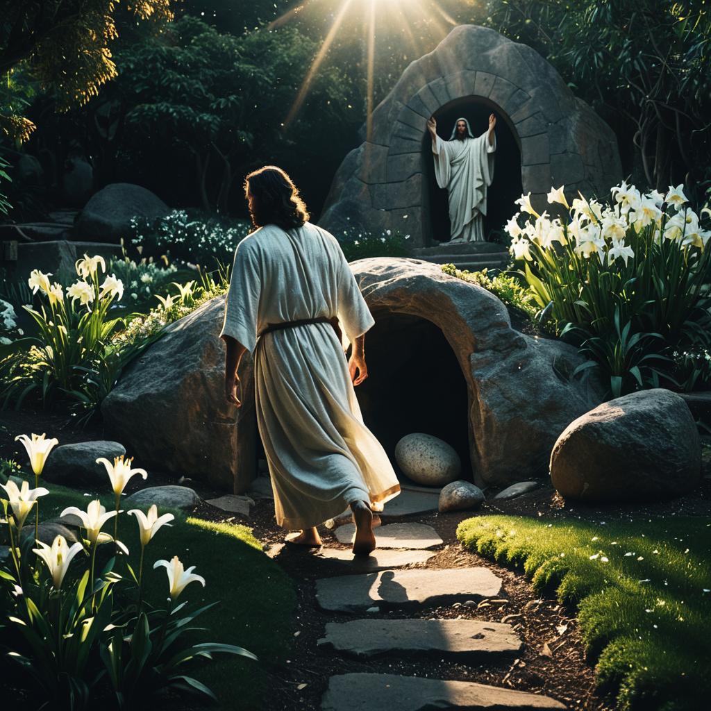 Photorealistic scene of the empty tomb with the boulder rolled away, illuminated by radiant, divine light shaped as a cross. Stone steps lead to the tomb entrance surrounded by rocky terrain and grass. A glowing basin is in the foreground with sunlight streaming through a partly cloudy sky, evoking a sacred and serene atmosphere.