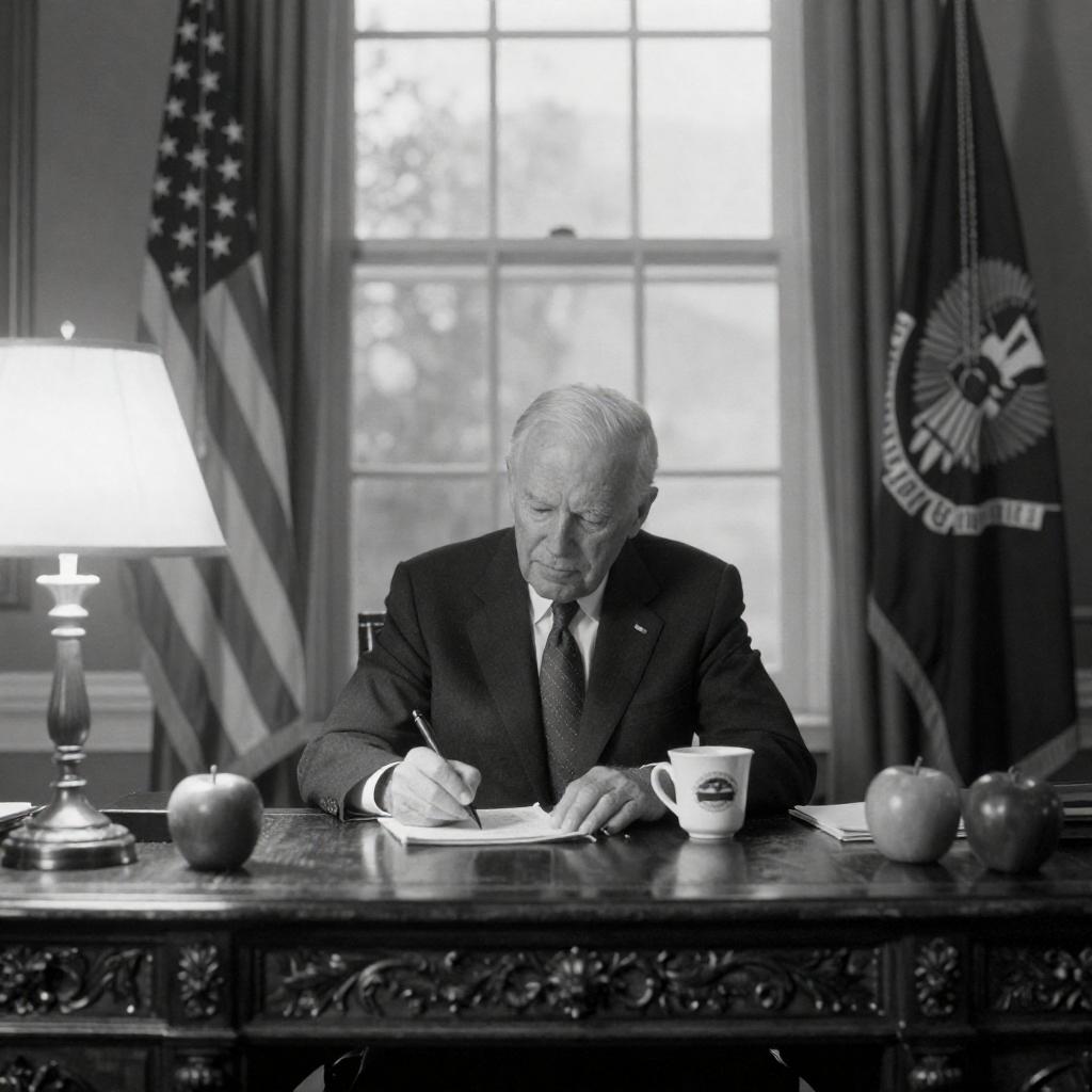 Black-and-white photograph of an elderly white man with white hair, dressed in a dark suit and tie, sitting at an ornate wooden desk. He is writing with a pen on paper, with a focused expression. The desk features two apples and a mug. Behind him are large windows and American and state flags, with a table lamp on the left side of the desk.