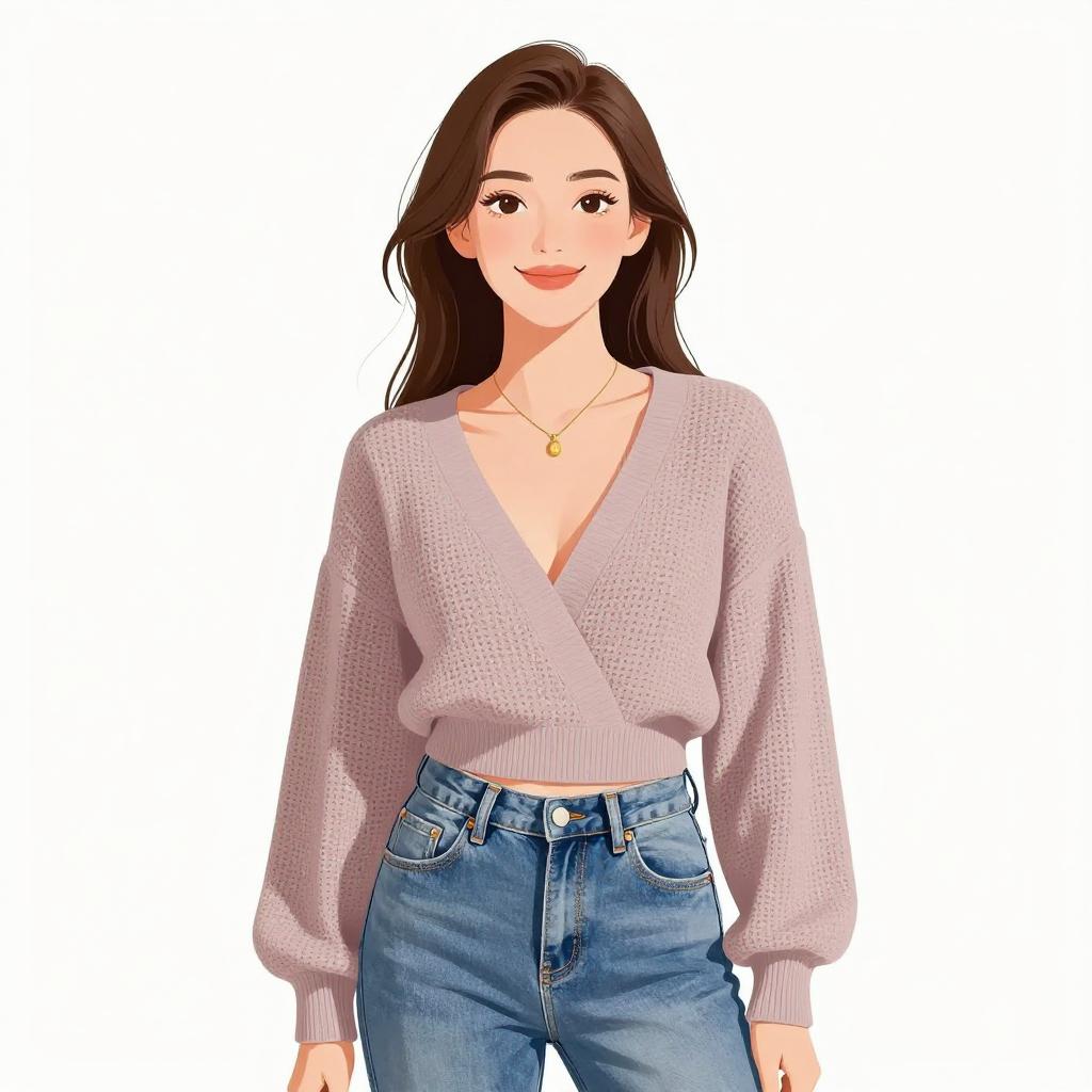 Digital illustration of a young woman with long brown hair and a pretty face standing against a white studio background. She wears a light mauve textured wrap sweater with a deep V-neckline, relaxed fit, and long sleeves, paired with light-wash high-waisted denim jeans featuring front button and zipper closure. She accessorizes with a delicate gold pendant necklace and light makeup, conveying a casual chic style.