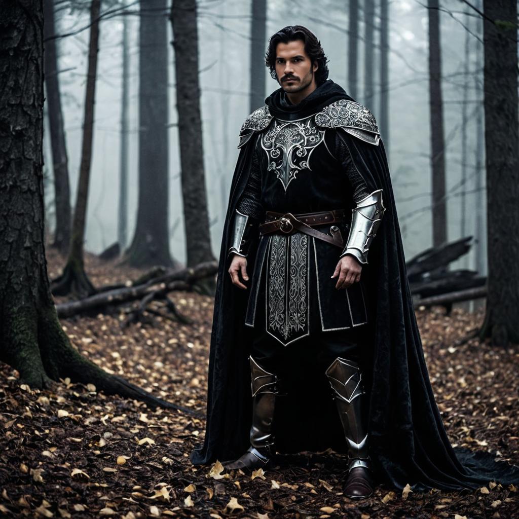 A medium build man with dark brown wavy hair and a mustache stands in a misty forest. He is dressed in an elaborate black medieval-style armor featuring intricate silver patterns on the chest, shoulders, and sleeves. The outfit includes a long black cape with silver shoulder details, leather belt, and matching arm and leg guards. The ground is covered with fallen leaves and tall trees tower in the foggy background. The man shows a serious expression, embodying a brooding and cinematic fantasy character.