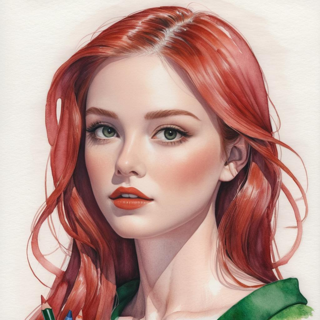 Close-up watercolor painting of a red-haired woman with green eyes and red lips, wearing a green garment over a white collared shirt. The artwork emphasizes detailed facial features and flowing hair.