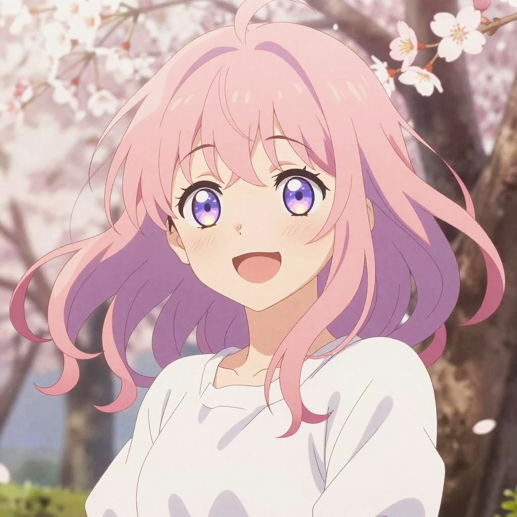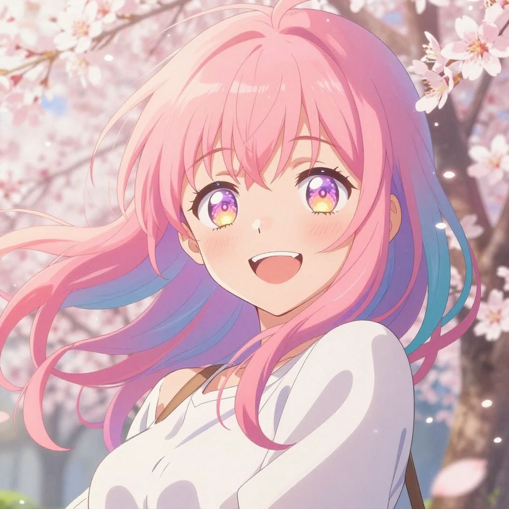 Anime mouth girl with a playful smile, vibrant pastel hair flowing in the wind, detailed eyes glowing with emotion, soft lighting, dynamic background of cherry blossoms