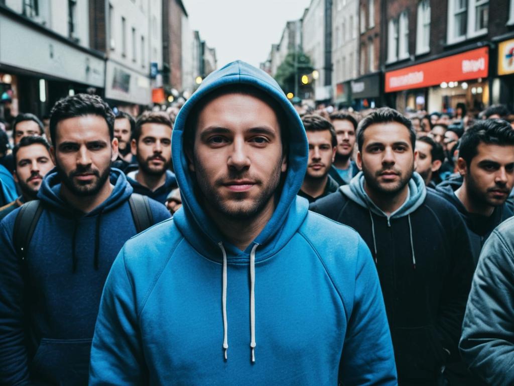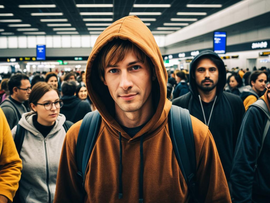 Scooby Costume Adults face swap, man in a brown hoodie standing in a crowded airport