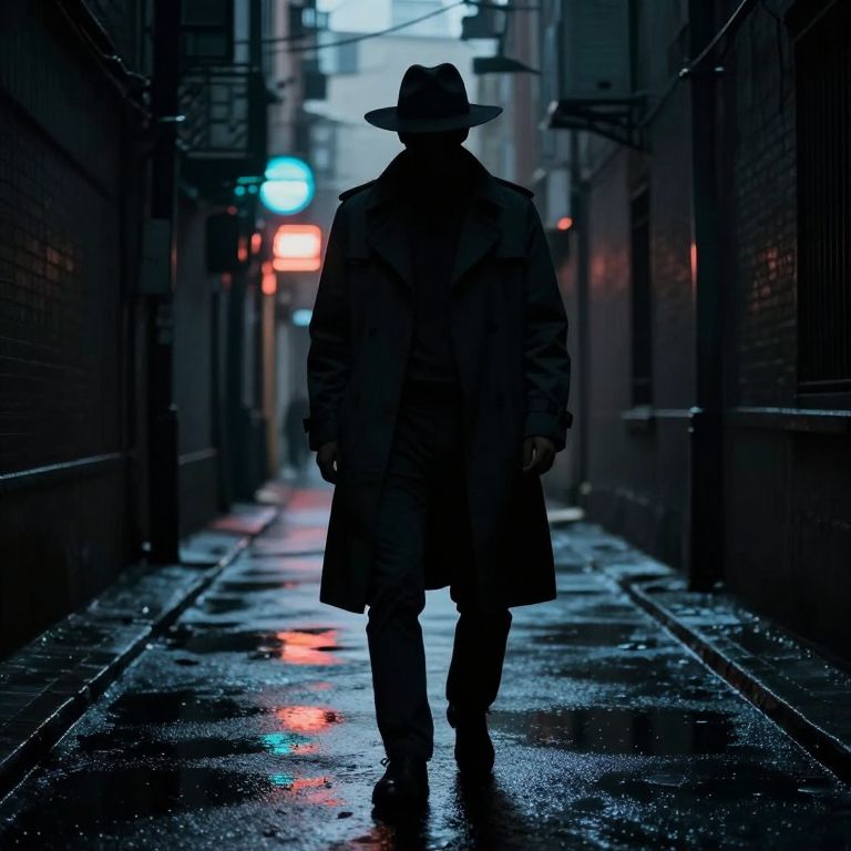 Asesino in a dark urban alley, silhouetted figure with a trench coat and a wide-brimmed hat, dramatic shadows and neon lights reflecting off wet pavement, intense and mysterious atmosphere, cinematic style.